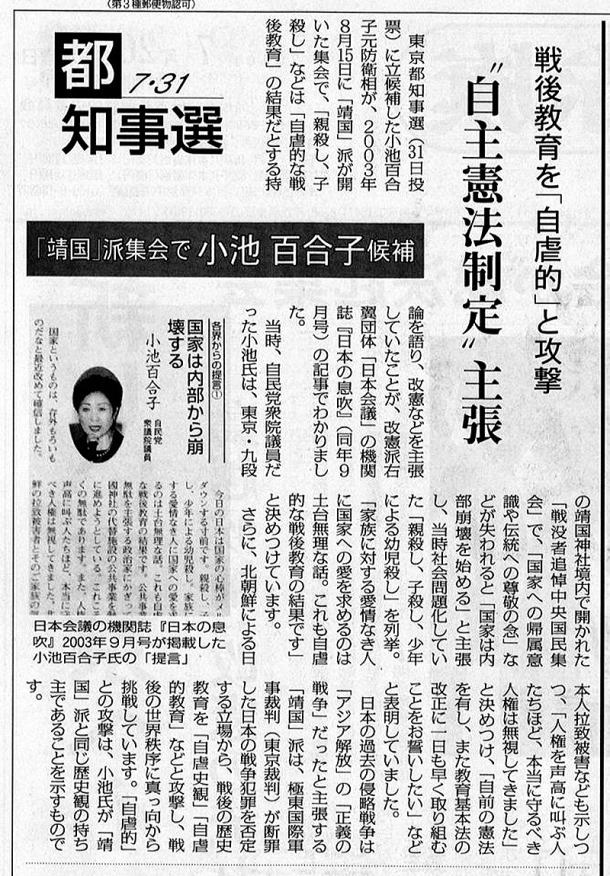そして小池氏は、今回の選挙戦でも「韓国人学校への都有地貸与の白紙化」や外国人参政権への反対を強く打ち出しており、都知事になれば社会を右に傾ける極右路線を邁進することは火を見るより明らかだ。さらに、かねてから日教組を“反日教育をしている”と敵視してきた小池氏は、都を発端に教育の改悪に着手する可能性も高い。たとえば憲法遵守を訴える都立学校の教員たちを取り締まるように仕向けるなどということもやりかねないだろう。もちろん、日本の中枢である都行政の“改憲教育”は、地方にも波及していく。安倍首相としては願ったりかなったりの状況なわけだ。 私たちは、このまま小池氏を都知事にさせて、安倍首相との“憲法破壊タッグ”を結成させてもいいのだろうか。有権者は投票前に、今一度よく考えてみてもらいたい。 (編集部) 【出典】LITERA 2016.07.29 |
