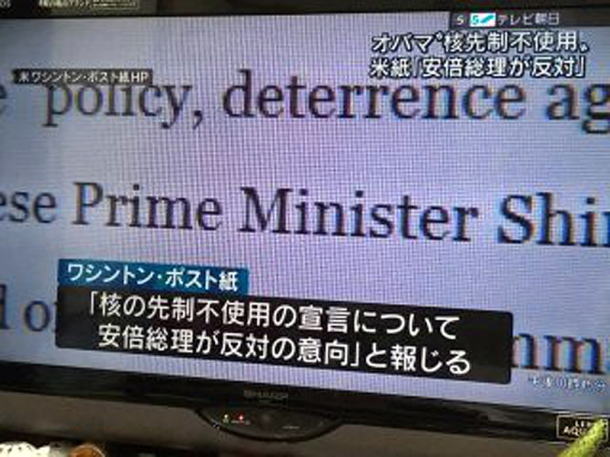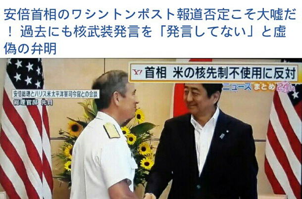 「ワシントンポストの原文を読んできて下さい。反対を示す言葉はどこにも書かれていません」「朝日は英語も読めないのか」「完全にマスゴミの仕業だな」「反日どもがいつものように大嘘を喚いているだけ」 まったく、バカに構うと日が暮れるとはこのことか。調べればすぐわかるのに嘘ばかり垂れ流すネットの安倍応援団は、元となったワシントンポストの記事をとくと読めばいい。以下が原文と翻訳したものだ。 〈Japan, in particular, believes that if Obama declares a “no first use” Policy-2017.html, deterrence against countries such as North Korea will suffer and the risks of conflict will rise. Japanese Prime Minister Shinzo Abe personally conveyed that message recently to Adm. Harry Harris Jr., the head of U.S. Pacific Command, according to two government officials.〉 〈もしもオバマが核の「先制不使用」を宣言したら、北朝鮮のような国に対する抑止力が損なわれ紛争のリスクが高まると、日本は信じている。2人の政府官僚によると、日本の安倍晋三首相は、このメッセージを最近ハリス太平洋司令官に直接、伝えた。〉