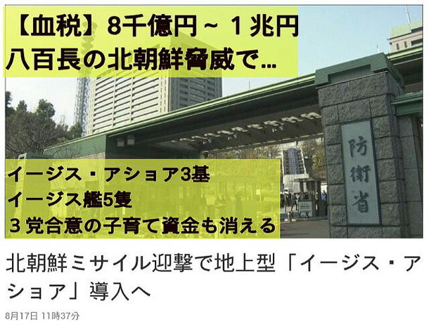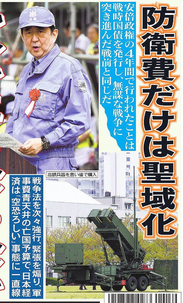 ![]() 4年連続で過去最大を更新だ。防衛省が8月31日に決定した2018年度の概算要求は5兆2551億円。17年度の当初予算から1300億円(2・5%)増やした。現在の中期防衛力整備計画(14〜18年度)で見込む年平均0・8%の増加を大幅に上回る水準だ。 とりわけ目立つのが、北朝鮮の弾道ミサイルに対応するための「ミサイル防衛」関連経費の増加だ。今年度予算から1142億円アップの1791億円を計上している。 8月17日に行われた日米外務・防衛担当閣僚協議(2プラス2)で“お買い上げ”を決めてきた陸上配備型迎撃ミサイルシステム「イージス・アショア」の整備費も盛り込むが、驚くのは、要求額が「未定」ということ。米国との協議を経て、年末に金額を確定させるという。要するに米国の言い値で買うわけだが、米ロッキード・マーチン社製のイージス・アショアは本体だけで1基800億円といわれ、日本列島をカバーするには少なくとも2基が必要とされる。この最低1600億円分は今回の総額に反映されていないから、実際の予算増額は1300億円どころじゃない。3000億円規模になる。 安倍政権は中国の海洋進出を口実に毎年、防衛費を増やしてきたが、北朝鮮のミサイル危機は「千載一遇のチャンス」とばかりに、ますますやりたい放題だ。海自のイージス艦に搭載する改良型迎撃ミサイル「SM3ブロック2A」の購入に472億円、空自の地対空誘導弾PAC3の改良型「PAC3MSE」に205億円。最新鋭ステルス戦闘機「F35」の6機買い増しに881億円。高高度無人偵察機「グローバルホーク」の取得に144億円、新型護衛艦2隻に964億円……。国内外で事故が多発しているオスプレイも4機の取得と関連経費に971億円を計上。これで配備予定のオスプレイ17機すべての取得経費計上が完了するが、その総額は3113億円に上る。 見境ないまでの“爆買い”には、一体どこにそんなカネがあるのかと言いたくなるのだ。 「軍事予算が聖域化し、何でもかんでも通るようになっている印象です。しかし、軍事費が膨らんだ分、国家予算はどこかを削ることになるのです。真っ先にカットされるのが、医療や年金などの社会保障費です。財政難だからと消費税を上げておきながら、国民の福祉を充実させるのではなく、米国製の高額武器を購入して、米国の軍事産業を喜ばせている。こんなの、どう考えてもおかしいでしょう。概算要求には、専守防衛の原則とする憲法9条に抵触するような危うい経費も計上されています。例えば、尖閣諸島などの離島防衛を名目にした『高速滑空弾』の研究費に100億円、長射程の『対艦誘導弾』の研究費に77億円を要求していますが、これらは敵基地攻撃能力に転用できるものです。国会で審議することもないまま、なし崩し的に敵基地攻撃能力を保有することには問題があると言わざるを得ません」(経済アナリスト・菊池英博氏) 日本は軍国化に舵を切った――。国際社会がそう判断するのは当然かもしれない。30日付の米紙ニューヨーク・タイムズは「日本が数十年間の平和主義の後に軍事力を受け入れ始めた」と題する特集を組んでいた。憲法改正を目指す安倍政権が、北朝鮮情勢の緊迫化を受けたミサイル防衛の強化などで防衛予算を拡大させていること。国民の間から平和憲法との矛盾を感じる声が出始めていること。日本専門家の「日本人は憲法の平和主義と防衛政策の矛盾を考えないようにしている」というコメントも紹介している。