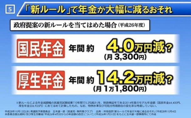 ![]() またも安倍政権が公的年金をズタズタにしようとしている。安倍首相は公的年金改革法案について、一昨日13日の参院予算員会で「今国会で審議し成立させてほしい」と明言した。 この法案は「年金カット法案」と呼ばれている通り、年金支給額を抑え込むものだ。2015年より安倍政権は年金カットのために「マクロ経済スライド」を適用したが、それでも物価が上昇しても賃金が下落した場合、年金は据え置きとなっている。 だが、現在国会に提出している年金法案では、物価と賃金で下落幅がより大きいほうに合わせて年金も減額するというもので、民進党の試算では、年金支給額は現在よりも5.2%も減少。2014年のデータにこの新たなルールを当てはめると、国民年金は年間約4万円減、厚生年金ではなんと年間約14.2万円も減るのだという。