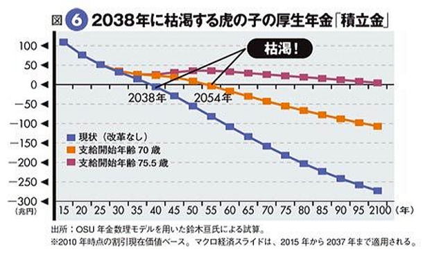 厚生年金の積立金は、2038年に枯渇する予定ですが、これを支給年齢70歳に引き上げることによって、2054年まで引き延ばすことができるとされています。更に75歳まで支給年齢を引き上げることによって、枯渇を引き延ばせるとされています。 しかし、問題にされているのは、多くの人が65歳〜70歳までに必要な生活費である500万円〜1000万円の退職金を全て使い果たしてしまう事になってしまいます。その後の人生というのは、年金がないままで老後を過ごさないといけないので、大変な人生を過ごさざる得ないという事になります。