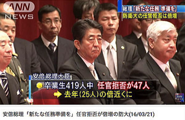 | さる3月21日、幹部自衛官を養成する防衛大学校(神奈川県横須賀市)で卒業式が行われ、“最高指揮官”である安倍晋三首相が得意満面で訓示した。 しかし、その内容は「恐怖」さえ感じさせるものだった。いつものスクランブル7倍増加話や日露戦争賛美に加えて、わずか十数分の話の間に4回も、自らを「最高指揮官」と呼び、こんなことを語り始めた。 「将来、諸君の中から、最高指揮官たる内閣総理大臣の片腕となって、その重要な意思決定を支える人材が出てきてくれることを、切に願います」 つまり、軍人を片腕にすることを宣言したのだが、もっと不気味なのはこんなフレーズだった。 「『事に臨んでは危険を顧みず、身をもって責務の完遂に努め、もって国民の負託に応える』。この宣誓の重さを、私は、最高指揮官として、常に、心に刻んでいます。(中略)諸君は、この困難な任務に就く道へと、自らの意志で進んでくれました。諸君は、私の誇りであり、日本の誇りであります」 「私の誇り」って、自衛隊はあんたの私兵なのか、と思わず突っ込みをいれたくなるではないか。 しかし、こうした安倍の自己陶酔的演説とは裏腹に、この卒業式では安倍が国民に知られたくない“不都合な事実”も露呈した。それは、卒業後に自衛官にならない任官拒否者が昨年の倍近い47人も出たことだ。 防衛大学校の学生は入学と同時に防衛省の職員とみなされ、入学金・授業料約250万円が免除されるほか給料も支給される。毎年数人の任官拒否者は出るが95%以上は幹部自衛官候補として任官する。今年は全卒業生419人で任官拒否が47人。拒否者が10%を超えるのは異例中の異例だ。しかも、これでも、数字を低く抑えたのだという。防衛省担当記者が解説する。 「実は、もっと多くの任官拒否者が出ると聞いていました。ところが、今年の卒業生は『集団的自衛権第1期生』といわれ世間の注目が集まっていた。任官拒否が急増すると政権批判の材料になりかねないので、官邸からの指令もあって例年に比べて引き止め工作が凄かったんです。中には教官が10人がかりで説得したという話もあるほど。もっとも、この段階で説得されて自衛官になってもすぐに辞める可能性が高いので、結果は同じことなんです。47人は氷山の一角に過ぎません」 表に数字が出てこないのであまり知られていないが、防大卒業後1年もしないうちに自衛隊を離れ、民間企業に転職する“隠れ任官拒否”も毎年数十人はいるらしい。それが今年はさらに倍増する見込みだという。それはそうだろう。日本の国を守るために危険を顧みない覚悟はできていても、アメリカの戦略にために命を危険に晒したくないと思うのは普通だ。ましてや「安倍の私兵」になんかなりたくないというのが偽らざる気持ちだろう。
