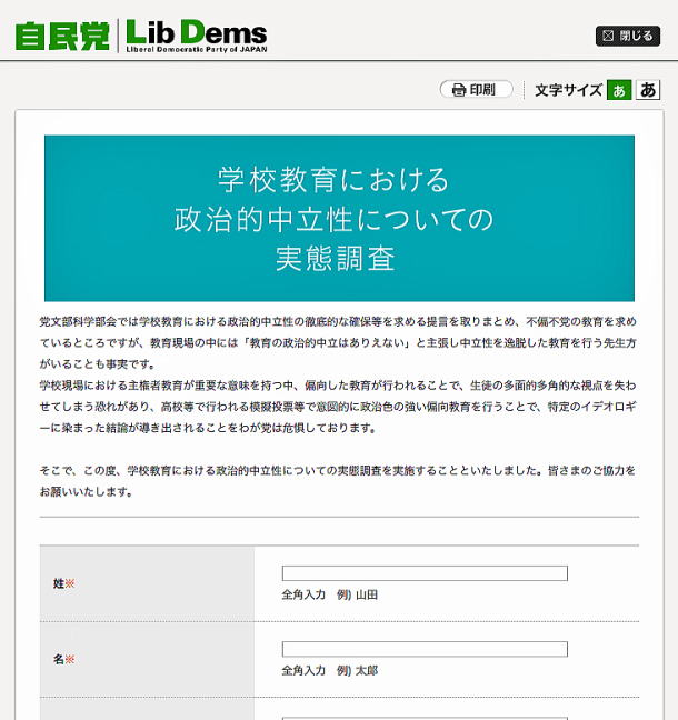 18歳選挙権を解禁させた初の国政選挙である参院選当日を控えたこのタイミングで、自民党が身の毛もよだつような“呼びかけ”を行っていたことがわかった。 それは、自民党のホームページに設けられた、「学校教育における政治的中立性についての実態調査」というタイトルのページだ。 そこには、げに恐ろしい文章が書かれてある。 《党文部科学部会では学校教育における政治的中立性の徹底的な確保等を求める提言を取りまとめ、不偏不党の教育を求めているところですが、教育現場の中には「教育の政治的中立はありえない」、あるいは「子供たちを戦場に送るな」と主張し中立性を逸脱した教育を行う先生方がいることも事実です。 学校現場における主権者教育が重要な意味を持つ中、偏向した教育が行われることで、生徒の多面的多角的な視点を失わせてしまう恐れがあり、高校等で行われる模擬投票等で意図的に政治色の強い偏向教育を行うことで、特定のイデオロギーに染まった結論が導き出されることをわが党は危惧しております。》 「子供たちを戦場に送るな」と主張することが、政治的中立性に反する逸脱した偏向教育……!? 生徒のことを思う教員ならば、「子供たちを戦場に送るな」と考えるのはごく自然、当然の話だ。逆にいえば、「子供たちが戦場に送られるのも仕方なし」と考える教員がいたら、そっちのほうが教師失格だろう。 だが、自民党は、それを「特定のイデオロギー」だと糾弾しているのだ。 しかも、自民党はこの文面のあとに、《そこで、この度、学校教育における政治的中立性についての実態調査を実施することといたしました。皆さまのご協力をお願いします。》とつづけ、投稿フォームを設置。 氏名や性別、連絡先などとともに、《政治的中立を逸脱するような不適切な事例を具体的(いつ、どこで、だれが、何を、どのように)に記入してください。》という書き込みができる入力欄を設けているのだ。 つまり、自民党は「子供たちを戦場に送るな」と言っている学校や教員を“密告”させ、個別的に“指導”を行う気なのだろう。 これは、学校に思想教育を強制し、子どもたちに「お国のために」と洗脳して戦場に駆り出した戦前戦中の教育体制と、なんら変わらないではないか。さらに、“密告”というやり口もまた、市民を監視させ合うという戦時体制そのままのものだ。 この“密告”フォームを自民党が設けたのがいつなのかは不明だが、7月7日に自民党文部科学部会長である木原稔衆院議員は、以下のようなツイートとともに投稿を呼びかけている。 〈残念ながら教育現場に中立性を逸脱した先生がいます。18歳の高校生が特定のイデオロギーに染まった結論に導かれる事を危惧してます。そこで、学校教育における政治的中立性についての実態調査を実施します。皆さまのご協力をお願いいたします。〉 木原議員といえば、あの「マスコミを懲らしめるには広告料収入をなくせばいい」発言が飛び出した「文化芸術懇話会」の代表を務めていた人物。この投稿も、まるでテレビメディアに電波停止と放送法をちらつかせて圧力をかけて黙らせたように、さながら18歳選挙権の解禁とともに学校側に“監視対象”であることを意識させ、萎縮を促すような書き方だ。 少なくとも、木原議員がこうツイートした7日にはこの“密告”フォームが公開されていたようだが、その後、SNS上で問題視する声があがりはじめると、8日夜に自民党はこのページを削除。さすがに参院選を目前にして批判が高まるのを恐れたのだろうが、こんな実態調査を堂々と公開した自民党の“戦前脳”には、つくづく背筋が凍る。 しかし、これで自民党の現在の考え方がどんなものなのか、よくおわかりいただけただろう。今回は削除したものの、参院選で改憲勢力3分の2の議席を獲得すれば、彼らは今後、もっと本性を剥き出しにして、愛国心教育とともに“国のために血を流すのが国民の務め”などという価値観を教育現場に再びもたらそうとするはずだ。 「そんな極端な」と思う人は、もう一度、上記の自民党の文言を読んでみてほしい。 自民党は、「子供たちを戦場に送るな」という声を偏向教育だとして取り締まろうとしているのである。これを戦前回帰と言わずして、何と呼べばいいのか。 一体、参院選で安倍自民党を勝たせたらどうなるのか。投票前によく考えてほしい。 (編集部) 【※7月9日午後3時、続報公開→(リンク)】 【出典】LITERA 2016.07.09 |