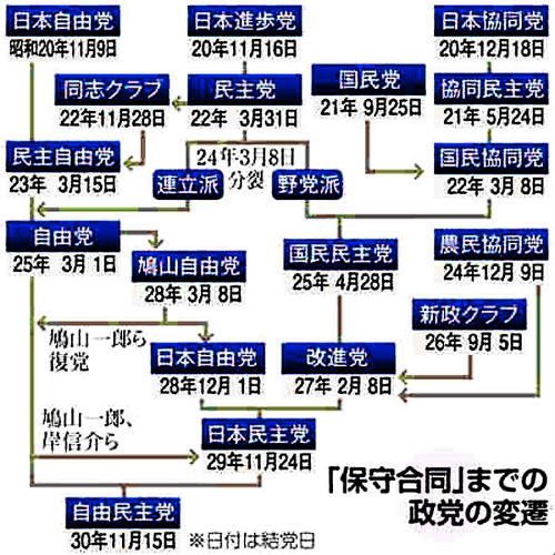 1955年(昭和30年)の「党の使命」では、冷戦下の国際情勢にあって社会主義や共産主義など東側諸国といった反米勢力を批判し、日本国憲法と戦後民主主義を“日本の弱体化の一因”と指摘。“正しい民主主義と自由こそが必要であり、わが党は憲法改正で国民の負託に応える”と述べた。