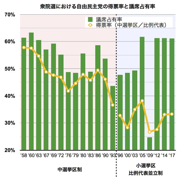 同じ選挙区の同僚議員は同じ政党でありながら当選を競い合うライバルだった。立候補者は一部を除いて党本部の応援を独占することができず、選挙区で個人の後援会を組織したり、さらには大物政治家の派閥に加わり、平時はその政局の駒となるのと引き換えに、選挙においては派閥の援助を受けた。互いに有権者の歓心を買うため、金権政治の温床ともなった。