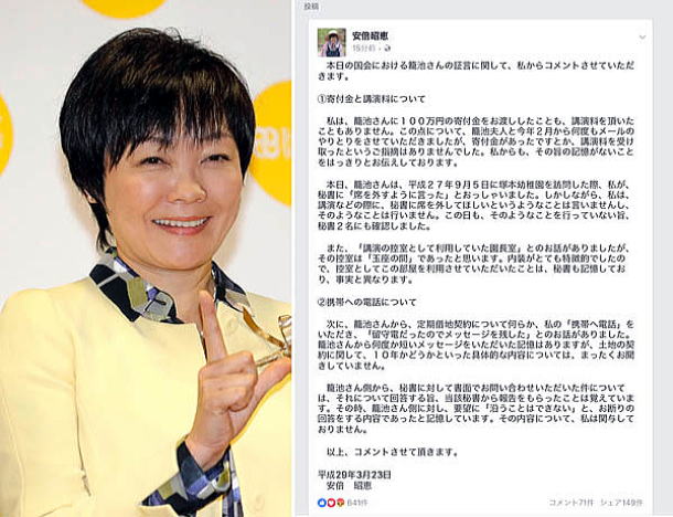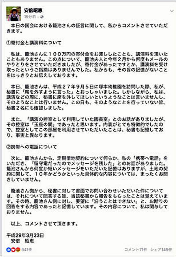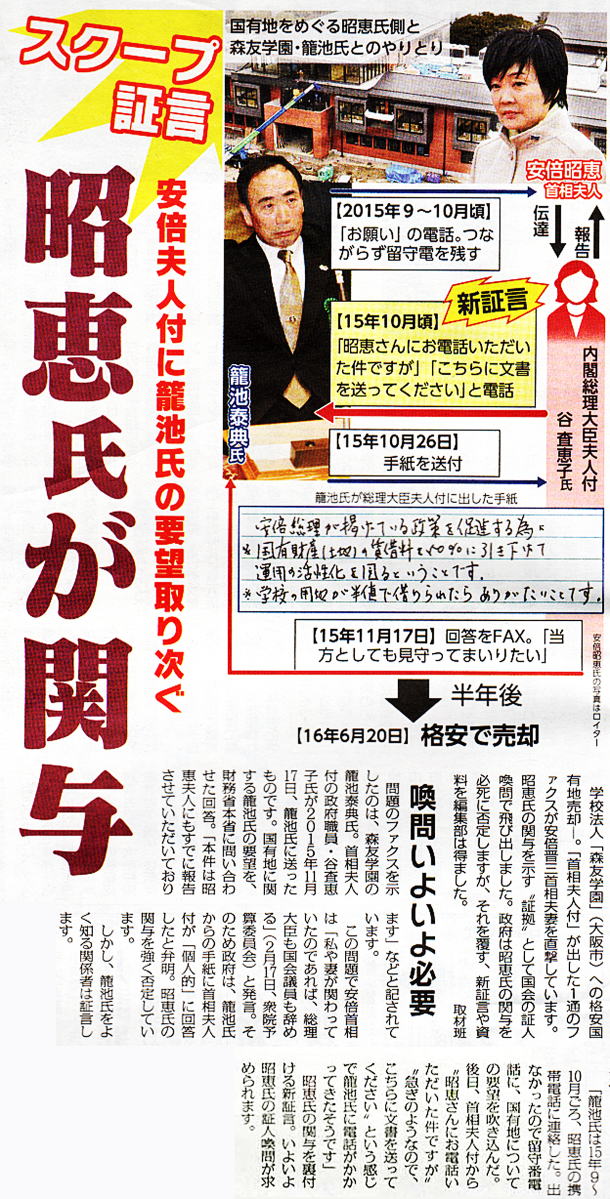 ![]() 「雌鶏歌えば家滅ぶ」ということわざがピタリ当てはまる。 大阪市の学校法人「森友学園」の国有地激安払い下げ問題で大揺れの安倍政権。学園の籠池泰典理事長が証人喚問で、首相の妻・昭恵氏から手渡された「100万円の寄付」証言に対し、政権側は昭恵氏がフェイスブックに投稿したとされるコメントを盾に反論。見苦しい言い訳を繰り返しているが、この昭恵コメントをよくよく読むと不自然な点が多く、官僚による「代筆作文」の疑いがあるという。 〈官邸側が作成して、昭恵夫人に投稿を依頼したのではないかとさえ思える〉