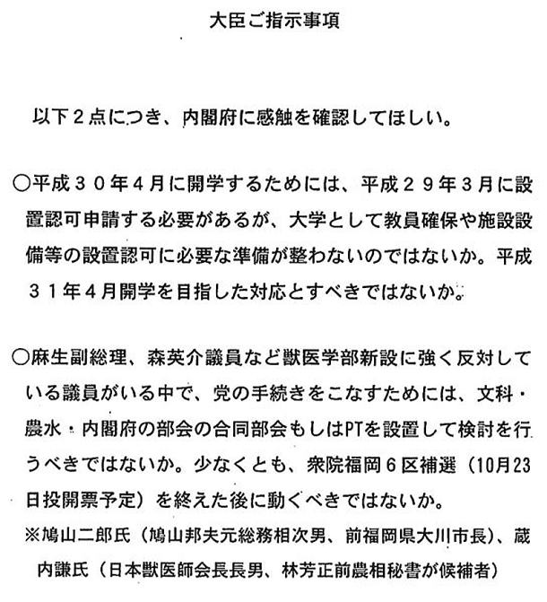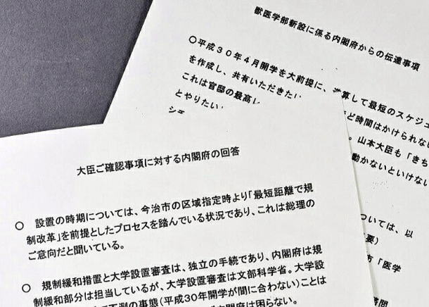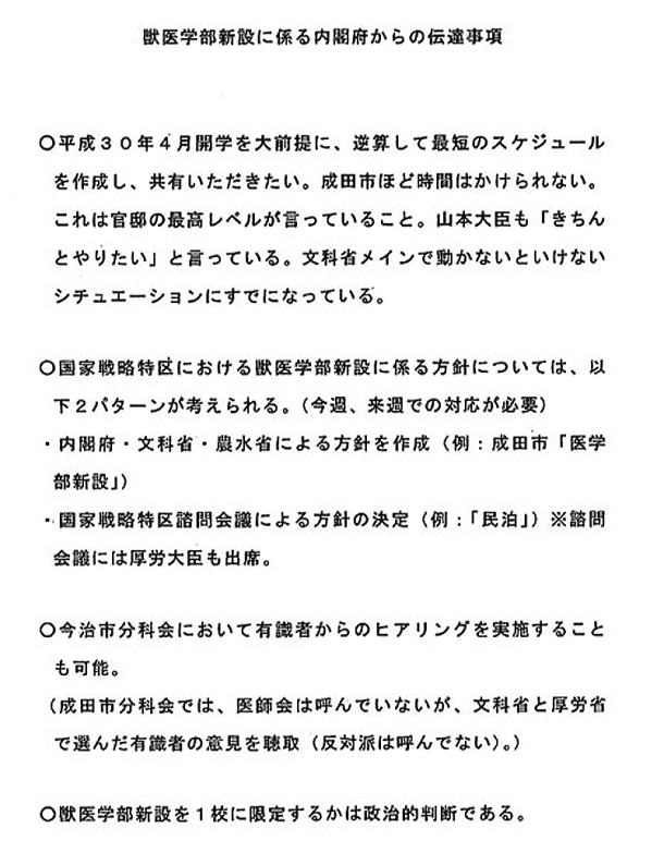安倍晋三首相の友人が理事長を務める学校法人「加計学園」(岡山市)が国家戦略特区に獣医学部を新設する計画で、特区を担当する内閣府が文部科学省に対し「官邸の最高レベルが言っていること」などと早期開学を促していたことを記録したとされる文書を巡り、民進党が、同様の内容で日時も記載された文書を同省の職員がメールで共有していたことを示すとされる文書を入手したことが分かった。2日午後にも同党が公表する。 民進党関係者によると、同党議員に送付されてきたという。同党側が入手したメールの写しとされる文書は昨年9月27日、文科省専門教育課の企画係長が、同省で国家戦略特区の窓口を務める大臣官房総務課行政改革推進室管理係長に宛てたものとされる。「Cc」の宛先から専門教育課の課長補佐ら十数人にも送られていたとみられる。 メールには、前日の同26日に特区を担当する内閣府の藤原豊審議官と文科省専門教育課の浅野敦行課長らが出席した会議の議事概要(「藤原内閣府審議官との打合せ概要」)との文書も添付されていたとされ、内閣府から文科省に対し「平成30(2018)年4月開学を大前提にスケジュールを作成し、共有いただきたい。これは官邸の最高レベルが言っていること(むしろもっと厳しいことを言っている)」などと要求する内容が記されている。専門教育課の企画係長が行革室の係長に宛てて「昨日の概要を共有します。こなし方については、現在(高等教育)局内で検討中です」との記載もみられる。【杉本修作】