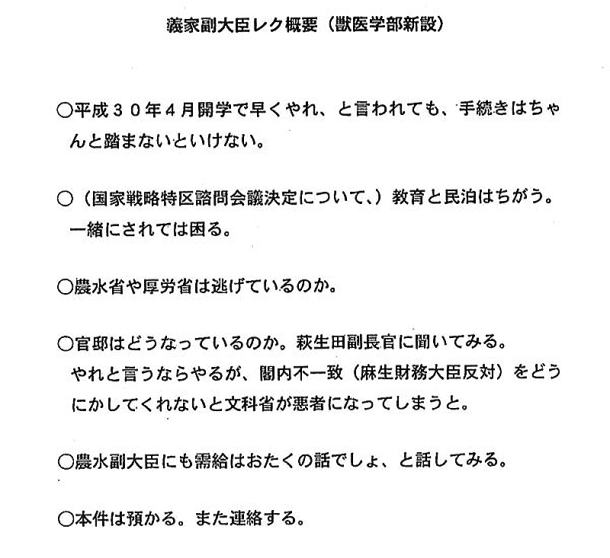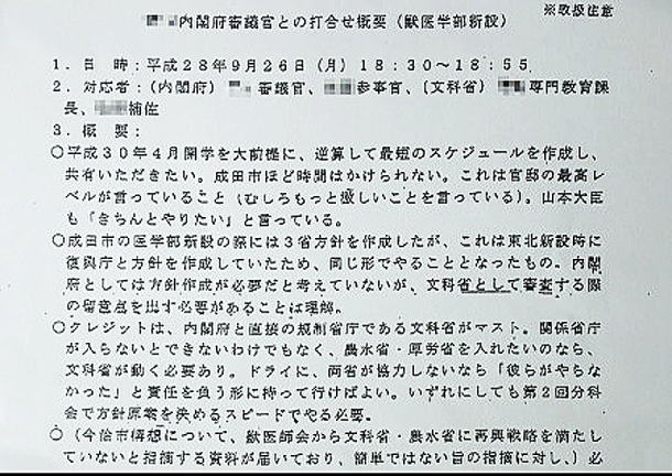 Business Journal 文=横山渉/ジャーナリスト 2017.05.21 5月17日付朝日新聞は、学校法人加計学園が計画する国家戦略特区における獣医学部設置計画をめぐり、特区を担当する内閣府が文部科学省に対して、「官邸の最高レベルが言っている」「総理のご意向」などと伝えたと記録された文科省の文書が存在すると報じた。 文書には文科省および首相官邸の幹部の名前も明記されているという。加計学園の加計孝太郎理事長は安倍晋三首相と親しい人物であり、安倍首相夫人の昭恵氏は同学園が運営する認可外保育施設「御影インターナショナルこども園」の名誉園長を務めている。 この問題については3月13日に福島みずほ参議院議員が予算委員会で質問していたが、そのとき安倍首相は関与を否定し、さらに「国会で実名や学校の名前を出して責任を取れるのか」などと感情的に反論した。 また、菅義偉官房長官も17日の記者会見で「総理から一切指示はない」と報道を否定。さらに19日には松野博一文科相が会見を行い、問題となっている文章は存在しないとの調査結果を報告し、「これ以上の調査は必要ない」と幕引きを狙ったが、野党は今後、国会で厳しく追及していく姿勢をみせている。 この問題は、永田町ではどのようにみられているのか。国会議員秘書のA氏は次のように語る。 「民進党・玉木雄一郎議員は朝日と同じ資料を入手したので、知り合いのマスコミ関係者を集めて、注目される環境が整ったところで、文部科学委員会で質問しました。委員会には事前に内容を詳しく通達していなかったようです。おそらく、以前から多少は加計学園に関して質問していたはずですが、大きな問題にはなりませんでした。19日に衆議院法務委員会で共謀罪法案が通過しましたが、このまま本会議でも通るでしょう。民進党はこの法案で攻め手を欠いており、点数を稼ぐためにも与党への攻撃材料がほしいという事情もあります」 文科省から流出したとされる内部文書だが、17日時点では、作成日時が記されていないことなどを理由に、菅義偉官房長官は「怪文書みたいなもの」と一蹴していた。しかし、翌18日には、日付・時刻や出席者入りの文書の存在が浮上したが、それでも政府は「信憑性は定かではない」と立場を変えなかった。A氏は経験的に「本物だと思う」と話す。 「官僚は打ち合わせをするときは必ず、ああいうメモを作成して記録として残します。ただ、それは自分たち用のメモなので、公的な文書なのかといわれれば違います。あの書き方は、公文書として決済を取るようなものではありません。文科省は文書の信憑性について『確認できなかった』との見解を示していますが、証明責任は民進党側にあるので、作成者を特定できなければ、このままあの文書をもとに政権を追及するのは難しいと思います」 しかし、永田町にはこんな話もあるという。別の国会議員秘書・B氏がいう。 「これだけ問題が大きくなる以前から、加計学園については安倍首相の意向を汲んで進められたのではないかと、自民党の議員も含めて話されていました。立地として愛媛県の今治に獣医学部が新設されることにも違和感が広まっています。また、文書が流出したのは『文科省だからだろう』ともいわれています。同省では天下りの問題をめぐり3月に大量の処分者が発表されましたが、これに象徴されるように、同省は他の省庁に比べて組織としてかなりお粗末です」 天下り問題では、直接的に関係のない官僚も後始末で仕事が増えるなどして、同省内は雰囲気的にかなり疲弊しているという。 「文科省上層部に不満を持っている内部の誰かが民進党にメモを渡したのではないか、と永田町ではいわれています」(同) ところで、獣医師の需給関係について、日本獣医師会は「不足していない」という立場で、1984年に文部省(当時)も獣医師の質確保のために新設や定員増を認めないとの方針を決定している。獣医学部は北里大学が1966年に青森県に開学したのが最後だ。しかし、ニーズについては、さまざまな見方がある。永田町関係筋のC氏が語る。 「動物園に勤務する獣医さんは不足しており、家畜の繁殖に関わる専門家も少ないといわれています。街で開業しているペット向けの獣医師というよりは、大きい動物の獣医さんが足りないようです。文科省は従来より、世界のなかで日本の大学のランキングを上げようという政策を推進しているのですが、もともと医学部を持っている大学に獣医学部を新設するほうが、メリットは大きいわけです。なので、医療関係者や大学関係者らのなかには『なぜ加計なのか?』と疑問に思う向きが少なくありません」 前出A氏は「安倍政権が長くなりすぎ、国民の政治への関心が低くなってきている。どんな問題でもいいので野党はもっと追及すべき。しかし、民進党の攻め方が下手」と語るが、真相解明のため、今後の野党の追及に期待したい。 Business Journal 文=横山渉/ジャーナリスト 2017.05.21