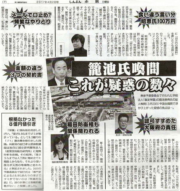 ![]() ネットで大炎上している大阪の国有地払下げ重大事件について、2月17日の衆院予算委員会で野党・民進党議員の追及がさく裂、これに改憲軍拡首相が慌てふためいて興奮、キレる事態が起きた。 問題過ぎる神道小学校の民族差別文書問題を、大阪府が行政指導をする事態を、籾井が辞めたNHKでさえも報じた。どうやら改憲軍拡首相の開き直り答弁が、墓穴を掘ってしまった春一番と受け止めた国民は、多いはずだ。 信じがたい破格の値段で、民族差別をする神道小学校に、国民の資産を預かっている財務省が、広大な国有地を払い下げた重大事件は、間違いなく政治がらみである。違うと考える国民はいないだろう。 麻生財務大臣の口利きも想像される。安倍と麻生の二人三脚内閣という格別の事情もあるが、自民党内の空気は、久しく病んでしまっている。内心、ほくそ笑んでいる実力者と入閣待望組の永田町である。新たな追及材料が噴き出るだろう。 それに大阪には、首相追及のプロが控えている。新たな材料がを、神社神道の日本会議が封じ込められるか? 「わたしや妻、事務所は一切関わっていない。関わっていれば、首相も国会議員も辞める」と議会で答弁した。内外に公約してしまったのだ。 人間という動物は、痛いところをつつかれると、動揺して、その分、精神が混乱して、言ってはならない言葉を口にしてしまう。それを改憲軍拡首相が演じた、2月17日の春一番ということになろう。 この首相答弁を、どう報じた新聞テレビが報じたか?それが、日本の言論の現状を証明することになる。賢明な国民は、このことで新聞購読を止めたり、進んで講読することになるだろう。