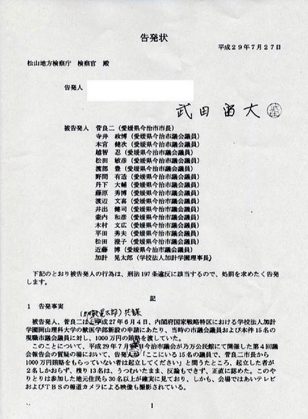 加計学園誘致を政策の目玉に掲げる今治市の菅良二市長。3期目を目指す選挙戦の準備を始めた去年10月頃から「(加計誘致は)安倍総理が全部やってくれているから、地元が口をはさむ余地はない」と話していたことが分かった。 菅市長に近い筋が田中龍作ジャーナルに明らかにした。菅市長は行く先々で上記のように話し、誘致成功を確信していたという。「(安倍首相が議長を務める)内閣府・国家戦略特区会議から今治市に頻繁に入ってくる情報で市長は確信を深めた・・・」と同筋は見る。 国家戦略特区の公募は、今年の1月4日開始で11日締め切り。1月20日、政府は加計学園を獣医学部新設の特区事業者に認定した。1校に限り認める、というものだった。 菅市長は特区公募開始の3か月前から加計学園が今治市で獣医学部を新設できるようになることを知っていたことになる。1校に限り認められるという狭き門をパスできることを知っていたのである。 同じ頃(昨年10月)、加計学園は特区事業者にまだ認定されていないにもかかわらず、今治市の市有地でボーリング調査を行っていたことも明らかになっている。 37億円相当の市有地は今年3月、加計学園に無償譲渡された。現在、獣医学部キャンパスの建設工事が進む。 加計学園が今治市でボーリング調査を行った翌月(昨年11月)、ライバルの京都産業大学は国家戦略特区の選から外れた。