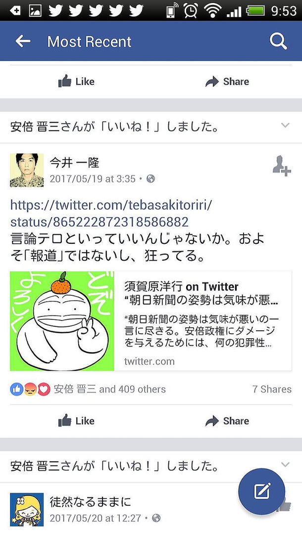 ![]() 共謀罪がついに先週、衆院法務委員会で強行採決された。安倍政権による政治の横暴は許しがたいものだが、しかし、まさにこのタイミングで、安倍首相がいよいよ本格的に牙を剥いた。 なんと、「朝日新聞は言論テロ」という投稿に、安倍首相が「いいね!」と同意したのだ。 安倍首相が「いいね!」したのは、5月19日に劇作家・今井一隆氏がFacebookで投稿した文章。今井氏は、マンガ家の須賀原洋行氏が加計学園の獣医学部新設に絡んだ「総理のご意向」文書問題で日本獣医師会顧問の北村直人氏が「文書に書かれていることは事実だ」と認めた朝日新聞の記事を〈朝日新聞の姿勢は気味が悪いの一言に尽きる〉と批判したTwitterへの投稿を取り上げ、このように意見を重ねた。 〈言論テロといっていいんじゃないか。およそ「報道」ではないし、狂ってる。〉