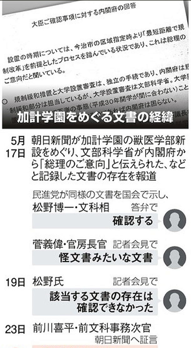 ![]() ウソとごまかしで国民を愚弄してきた安倍晋三首相だが、もう「知らぬ存ぜぬ」は通用しない。“第2の森友疑惑”といわれてきた加計学園の獣医学部新設計画について、朝日新聞が17日の一面ですっぱ抜いた文書は衝撃的だ。 この文書は文部科学省が昨年9〜10月に作ったとされるもので、本紙も入手、分析した。そこには国家戦略特区担当する内閣府と文科省の生々しいやり取りのメモが残されている。加計学園のために早期の獣医学部新設を求める内閣府、「準備が整わない」などと渋る文科省。こういう構図のなか、内閣府サイドは「これは官邸の最高レベルが言っていること」「総理のご意向だと聞いている」などと迫っている。 政権トップの強い関与を示す生々しい文言が文書には残されているのである。 今年3月、国会でこの加計問題が取り上げられた際、安倍は「もし働きかけて決めたならば責任を取る」と全面否定で啖呵を切った。この文書が本物ならば、安倍の答弁は大ウソだったことになる。もう絶対絶命だ。 菅官房長官は文書に日付や作成部局が記されていないことから、記者会見では「出どころも明確でない怪文書じゃないか。そんな意味不明のものについて、いちいち政府が答えることではない」と突っぱねたが、苦しい言い訳だ。 17日の衆院文科委員会で松野博一文科相が、「特区の対応に向けた文書が作成された可能性はある」「文書自体に関しては確認させていただきたい」と答弁しているのに、確認もせず“怪文書”扱いする菅は、その狼狽ぶりで疑惑を深めた格好だ。 文科委で追及した財務官僚出身の玉木雄一郎議員(民進党)はこう言う。 「外形的に見れば、あれは役所の文書です。機微に触れるため、名前も日付もない“詠み人知らず”の文書を、私も(官僚時代)よく作っていました。後で足がつかないようにするためで、幹部間で共有し、保存するのです。トップダウンのリーダーシップで特区を進めることは否定しませんが、その動機やプロセスに公平公正が求められるのは当然。しっかりしたチェックが必要です。今後も徹底的に追及していきます」