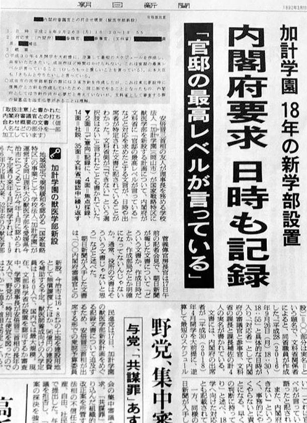 ![]() 内部文書の再調査を宣言した安倍政権だが、案の定、その腰は重い。文書やメールが実在するのか/したのかなんて1日もあれば調べられるだろうに、結果報告はきょうもなし。だいたい、萩生田光一官房副長官も「資料が実在したとしても、その紙自体が正しいかどうかっていうのは、その次の話だと思いますよ」と言い放つなど、すでに「文科省の事実歪曲」「内閣府が勝手にやったこと」などという“オルタナファクト”な落着点を示唆している。本気で検証する気などさらさらないのだ。 だが、官邸がいくらごまかしても、疑惑は止まらない。きょうもまた別の角度から、新たな証言・事実が出てきた。 そのひとつが、松野博一文科相の“虚偽答弁”の発覚だ。2016年9月6日に松野文科相が加計孝太郎理事長と、文科省OBで加計学園理事を務めていた豊田三郎氏と面談していたことについて、松野大臣は「(その場は)大臣就任への挨拶をいただいた」「獣医学部にかんする話は一切なかった」と答弁していたが、きょう、その席に同席した関係者が“加計学園側が獣医学部の構想を大臣に直接伝えていた”と証言していることをTBSが伝えたのだ。 内部告発が続いている文科省だが、今度は文科省トップの松野大臣自らが“事実の隠蔽”を行っていたことが明らかにされたというわけだ。これでは、文科省の内部資料がないことにされてしまったのも当然だろう。 今後も、松野大臣が官邸の意を受けて疑惑隠蔽に動くのは必至で、そうした隠蔽を阻止するためにも、マスコミと野党はこの虚偽答弁を徹底追及して、松野を辞職に追い込む必要がある。 そして、もうひとつ判明した新証拠は、加計学園が昨年11月に実施したボーリング調査にかんする事実だ。本日の『羽鳥慎一モーニングショー』(テレビ朝日)では、今治市が情報開示した資料7840ページ分の検証途中経過を放送。そのなかで判明したのは、2016年10月31日に加計孝太郎理事長が獣医学部予定地のボーリング調査の申請書を今治市に提出。なんと同じ日に今治市は、ボーリング調査を承諾し、土地調査も開始されていたのだ。 そもそも、国家戦略特区による獣医学部新設の事業者に加計学園が選ばれたのは、今年の1月20日のこと。にもかかわらず、昨年11月の段階でボーリング調査が行われていたことには疑問の声があがっていた。 だが今回、番組が明らかにした資料によって、まだ京都産業大学にも獣医学部新設の可能性があった段階で、ボーリング調査が申請されたその日に今治市がそれを承諾し、土地調査が開始されるという“異常事態”が起こっていたことが判明。これには番組の取材に応じた不動産コンサルタントの長嶋修氏も「申請から自治体の承諾を得られるのは、少なくとも数日から1週間はかかる」「そもそも土地調査をするのは、基本的にこの土地で建設するという確証がないと行わない」と指摘している。 まるで森友学園を彷彿とさせる話だが、なぜ、このような無茶苦茶な工程を今治市は踏んだのか。それは「加計学園の獣医学部新設は決定事項」であり、「内閣府の指示」があったからとしか考えられない。 事実、きょうの同番組ではこのこと以外にも、内閣府が今治市に働きかけた数々の証拠が報道された。 本サイトでも、ジャーナリストの横田一氏が指摘していたが、今治市が開示した大量の資料のなかには、内閣府が「加計学園ありき」で動いていたことを示すさまざまな資料があった。番組はそれらをピックアップ。2016年8月3日に内閣府から今治市職員に対し、〈各者でスケジュールの共有を図り、当事務局からも、そのスケジュールに合わせ、進捗を確認できる体制をつくるべく(中略)今治市のスケジュール表を作成願います〉と書かれたメールが送られていたこと、翌4日に今治市が作成したスケジュール表には「H30.4月開学予定」「(2016年12月に私有地の)無償譲渡案」と書き込まれていたことを紹介した。 また、今治市企画課が作成し、2016年10月25日に市議会で配られた資料でも、「スケジュール感」として〈内閣府としても最速で平成30年4月の開学を目指していることが伺える〉という記述があることを報じた。 何度も言うが、加計学園が事業者に決定したのは今年1月であり、事実上、ライバルだった京産大が脱落したのも、国家戦略特区諮問会議が〈広域的に獣医学部が存在しない地域に限る〉と決定した昨年11月9日のことだ。しかし、今治市の資料を見れば、それ以前の時点から、内閣府とともに2018年4月開学ですりあわせしてきたことが示されている。 ここで問題になってくるのは、一体いつから獣医学部新設は「加計学園ありき」で進められたのかということだろう。きょうの『モーニングショー』では、この点について、テレビ朝日の玉川徹氏が重要な指摘を行った。 玉川氏は、現在、校舎の建設工事を行っている今治市のキャンパス予定地の映像を見ながら、今年1月の決定から半年でかなり工事が進んでいることを疑