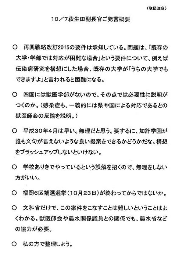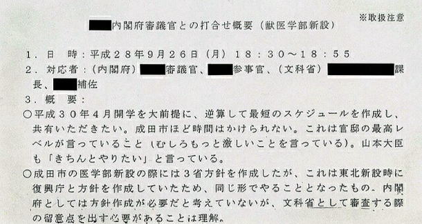 安倍晋三首相の友人が理事長を務める学校法人「加計(かけ)学園」が国家戦略特区に獣医学部を新設する計画について、今年1月まで文部科学事務次官だった前川喜平氏(62)が23日、東京都内で朝日新聞の取材に応じた。内閣府から文科省に「総理のご意向」などと伝えられたと記された文書について、前川氏は自らが担当課から説明を受けた際に示されたと証言。獣医学部の新設については、加計学園を前提に検討が進んだとして、「行政がゆがめられた」と語った。 前川氏が証言した文書は民進党が国会で示し、文科省に調査を求めたA4判の8枚。この中には、文科省が最短のスケジュールで獣医学部新設を実現するよう、内閣府から「官邸の最高レベルが言っている」「総理のご意向だと聞いている」などと言われたと記された部分がある。朝日新聞も同じ文書を入手している。 前川氏はこの文書について「獣医学部の新設について、自分が昨年秋に、担当の専門教育課から説明を受けた際、示された」と証言した。同氏によると、昨年9月9日〜10月31日に計6回、専門教育課の課長や課長補佐らと事務次官室で獣医学部の新設について打ち合わせをした。9月28日の打ち合わせでは、「『獣医学部新設に係る内閣府からの伝達事項』との文書を示されたと記憶している」という。 また「総理のご意向」「官邸の最高レベル」などの文言について「誰だって気にする。(文科省側が)圧力を感じなかったといえば、うそになる」と述べた。 獣医学部の新設予定地の愛媛県今治市や同県は加計学園とともに、小泉政権が始めた「構造改革特区」での獣医学部新設を15回提案したが、文科省がすべて却下。安倍政権が設けた国家戦略特区で、2015年に県と市が獣医学部新設を提案した。 獣医学部新設を認める際は、獣医師の需要見通しなどを検討することが前提となる。しかし今回は、需給をつかさどる農林水産省や公衆衛生を担当する厚生労働省から、獣医師が足りないとの需給見通しや、新分野での必要な人材ニーズなどが示されない中で、内閣府から新設を認めるよう求められていたとして、「内閣府の言い分は『トップダウンで決めるから文科省は心配するな』ということだと受け止めた」と振り返った。 さらに「踏むべきステップを踏めず、筋を通せなかった。『こんなことは認められない』と私が内閣府に対して強く主張して筋を通すべきだった。反省している」と語った。 一方、8枚の文書について、菅義偉官房長官は17日の記者会見で「怪文書みたいな文書じゃないか」と述べ、松野博一文科相も19日、「該当する文書の存在は確認できなかった」とする調査結果を発表した。前川氏は「あるものが、ないことにされてはならないと思った」と語った。 朝日新聞は24日、文科省に対し、文書について(1)専門教育課が当時の事務次官への説明で示したのか(2)同課で作成したのか――などについて書面で質問したが、同省は「行政内部のことで、回答すべきものではないので、お答えできません」と書面で答えた。 前川氏は事務次官だった今年1月、文科省の違法な「天下り」問題に自ら関与していたとして減給処分を受け、引責辞任した。 ◇ 〈加計学園の獣医学部新設計画〉 地域限定で規制緩和を認める「国家戦略特区」の事業として、学校法人「加計学園」が運営する岡山理科大の獣医学部を愛媛県今治市につくることが今年1月に認められた。予定通り来年4月に開学すれば、1966年の北里大以来、52年ぶりの獣医学部の新設になる。今治市は16・8ヘクタールの土地を建設用地として無償譲渡したほか、愛媛県と今治市で96億円の建設費を補助する予定。 獣医師養成向けの入学定員は160人で、国内では最大規模。現在、文部科学省が設置を認可するか審査中。学園理事長の加計孝太郎氏が安倍晋三首相の長年の友人で、異例のスピードで特区での新設が認められたことなどから、野党が「特別な便宜が図られたのではないか」と追及している。 朝日新聞社