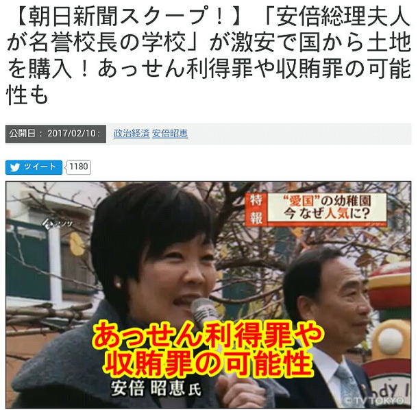 ![]() ネットにすごい情報が飛び交っている。日刊ゲンダイで確認したのだが、朝日新聞やロイター通信までが報道している。「危うし安倍スキャンダル」を連想しても不思議ではない。国有地払下げ事件の発覚である。国有地払下げを特別配慮したとなると、これは権力の乱用しか考えられない。教育勅語を園児に暗唱させている学校法人だと、日本会議とも連なる。本日の議会とメディアの力量が問われる春一番になるのか。 日刊ゲンダイの後追い記事がネットで大炎上中である。久々の一大スキャンダルの発覚と、国民誰しもが感じるだろう。朝日が2月9日付で、大きく報道しているという。ロイター通信は、朝日の前か後ろか、筆者にはわからないが、追及次第では政権の命運を左右する、世紀の政治スキャンダルに発展しかねない。 報道によると、この国有地払下げ事件は、実に荒っぽく大胆である。小選挙区制下の3分の2議席は、腐敗を招き寄せる。拙著「小選挙区制は腐敗を生む」(エール出版)で指摘した通りである。 官邸かその周辺からの意向を、国有地を管理する財務当局も抵抗は出来ない。 相場の10分の1の値段という。1平方15万円相当の国有地8870平方、約13億円相当を、大阪府の森友学園という学校法人が、わずか1億3400万円で手に入れたという重大な疑惑である。 荒っぽくも、大胆不可解な国有地の分捕り・払下げ事件であろうか。いかなる釈明も通用しそうもない。背後関係を徹底して洗うことで、真相を暴くことは容易であろう。