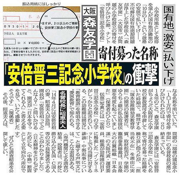 繰り返される安倍外遊に、ぴったりと寄り添う夫人が、学園の名誉校長ということから、国有地の格安払下げ疑惑を、一段と深めさせている。政治的圧力を裏付けている。 安倍夫人が動いたものか、彼女の意向を首相秘書官が代行したものか、首相自身の間接的口利きに周辺が動いたものか。そうでもない限り、10分の1の格安値段での国有地の払下げは考えられない。 あるいは森友学園は、安倍後援会メンバーなのかどうか。政治献金の有無はどうか。闇献金組なのかどうか。疑問は膨らむばかりである。 この学園の総長は、安倍内閣を背後で操作する日本会議の幹部ということも、国有地払下げ事件の疑惑を深めさせているようだ。安倍夫人の名誉校長と学園総長が日本会議幹部と、あまりにも政治的な役者がそろい過ぎている。 この顔ぶれで払下げを要求されると、国有地管理当局も腰が引けるのかもしれないが、さりとて10分の1という格安での払下げは無理だ。上からの、さらなる大きな力がないと不可能であろう。 内部告発の行方も注目される。 園児に教育勅語を暗唱させている!これも驚きである。教育勅語は、国家神道と帝国憲法と肩を並べる、戦後否定された戦前の「神がかりのカルト・狂信的な天皇制国家主義」を構成する3大原理の一つである。 ロイター通信は「学園のカリキュラムは、戦前の日本を想起させる」と適切な表現で報じた。 安倍・日本会議お手本の学園ゆえの、格別の国有地払下げの可能性も高い。 徹底した、さらなる取材と議会の追及が不可欠であろう。