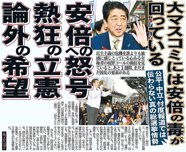 実際、自民党は公示前の284議席から、50以上議席を減らしてもおかしくない。逆転可能の選挙区が50近くあるからだ。時事通信の情勢調査でも「当選圏内」は150に過ぎない。もし、50以上減らしたら、たとえ自公が過半数を確保しても、選挙後、安倍首相は退陣に追い込まれる可能性がある。 それにしても、大手メディアの選挙報道はどうかしている。 もともと10.22総選挙の争点は、モリカケ疑惑であり、解散に大義があるのかどうか、だったはずである。もし、大新聞テレビが、この2つを大々的に取り上げていたら、安倍は追い込まれていたはずだ。実際、解散直後には、自民党は大幅に議席を減らすと予測されていた。 ところが、解散後、大手メディアは、この2つについてまったく触れなくなっている。大新聞テレビが報じないから、いつの間にか争点からも消えてしまった。結果的に安倍を助けているのは明らかだ。 公平・中立な報道を隠れみのに、「自民堅調」などと調査結果をタレ流しているだけである。 「大手メディアの甘い報道に安倍首相はホッとしているはずです。もし、欧米先進国で、国民に支持されていない政権が選挙で圧勝するような情勢調査が出たら、メディアは黙っていないでしょう。有権者に対して、本当にそれでいいのか、民主主義が機能していないと警告を発するはずです。まして、安倍首相は、国民のヤジを恐れて、遊説日程を直前まで明らかにしないようなトップです。平然と『自公300超うかがう』などと報じるなど考えられないことです」(政治評論家・本澤二郎氏) なぜか、大手メディアは、枝野代表の街頭演説に聴衆が殺到していることも伝えようとしない。安倍政権の毒が回っているのではないか。 それもこれも、大新聞テレビに危機感がないからだ。 この総選挙で自民党を圧勝させたら、安倍政権は4年後の2021年まで続くことになる。そうなったら、この国の民主主義はもう終わりだ。「戦後レジームからの脱却」を掲げる安倍が、安倍政治の総仕上げをしてくるのは間違いない。すでに「自衛隊を明記した条文を追加する」と改憲案を明らかにしている。 「どんなに支持率が低くても、選挙に勝ったら、安倍首相が『国民に信任された』とやりたい放題やってくるのは明らかです。もちろん、“モリカケ疑惑”など過去の不祥事も帳消しになるでしょう。野党が追及しても『自分は国民に支持された』と一蹴するのは目に見えています。あと4年間、議会も暴走を止められなくなる。それどころか、希望の党と保守大連立を組む可能性さえある。恐ろしいのは、安倍首相は個人の“私的領域”や“思想信条”にまで踏み込もうとすることです。道徳を教科化し“価値観”を押しつけている。個人の価値観にまで干渉するのは、独裁者の特徴です。4年間で国民生活は相当、息苦しくなりますよ。立憲民主党が支持を拡大しているのも、多くの有権者が、安倍政治にストップをかけないと大変なことになると危機感を強めているからでしょう。10月22日の総選挙は、あとから振り返ると、歴史のターニングポイントになる可能性がある。戦後民主主義の存亡をかけた戦いになると思います。なのに、大手マスコミは、国民に比べても危機感が薄すぎます」(立正大名誉教授・金子勝氏=憲法) 大マスコミは「自公300議席」などと報じているが、まだ選挙情勢は大きく変わる。有権者は絶対にあきらめてはダメだ。 【出典】日刊ゲンダイ 2017年10月16日