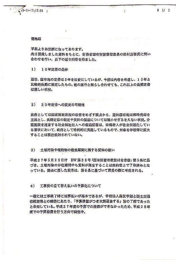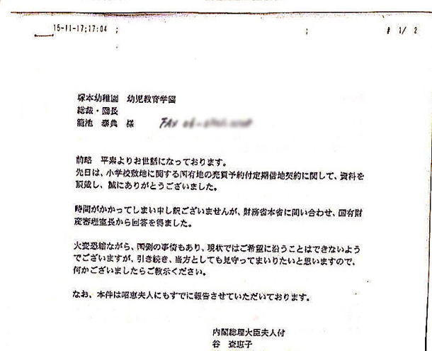 FAXによって安倍昭恵夫人の土地取引への関与が取り沙汰されているが、本日、さらに驚きの“物証”が出てきた。本日開かれた参院決算委員会で、共産党の大門実紀史議員が疑惑の“手紙”の内容に踏み込んだのだ。 この手紙というのは、籠池泰典理事長の証人喚問の際、自民党の西田昌司議員が公開した籠池理事長から昭恵夫人付きの職員である谷査恵子氏へ送ったとされる封筒の中身にあたるもの。この手紙の返答が、件のFAXだと見られていた。証人喚問で西田議員はなぜか封筒のコピーしか取り上げず、肝心の中身に触れようとしなかったのだが、この手紙のコピーを共産党が独自に入手したのだという。 そして、この手紙の中身は衝撃的なものだった。大門議員は手紙のなかで籠池理事長が谷氏へこのような依頼をしていたと明かす。 「定期借地契約が10年なのは短すぎる。50年契約にした上で、じつはいちばんの眼目は『早く買い取ることはできませんか』ということ」 件のFAXでは、籠池理事長が土地の買い受け特約が10年であるところを50年契約にできないかともちかけていたと思われ、実際に財務省の国有財産審理室長は〈これ以上の長期定借は難しい状況〉と返答していた。だが、この手紙の本題は契約期間の延長ではなく、「国有地を早く買い取りたい」ということだったのだ。 しかも、籠池理事長は手紙のなかで「賃料が高い」「賃料を半額程度にしてもらえないか」と要望。また、工事費の立て替え払いについても「平成27年度予算で返してくれると言ったのに、平成28年度に遅れるのは何事か」と記述しているという。 この手紙の内容は極めて重要だ。なぜなら、これらの籠池理事長の要望は、その後、すべて叶えられているからだ。手紙は2015年10月26日に送られたものだが、その後、2016年4月6日という平成28年度予算がはじまってたった6日というスピードで工事費の立て替え分1億3176万円が支払われ、さらには同年6月20日にごみの撤去費用8億1900万円を差し引いた1億3400万円という格安価格で国有地を売却。 15年5月に近畿財務局と締結した貸付契約では月額賃料が227万5000円だったが、この16年6月の契約では、頭金が2787万円、毎年1100万円と延納利息1%という10年間分割払いという内容で、月額にすると100万円以下となる。手紙当時の月額賃料227万5000円から見事に「半額以下」となっているのだ。