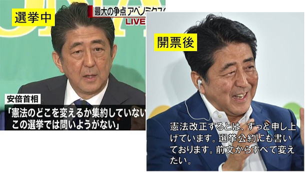 「与野党にかかわらず、幅広い合意形成に努める」――。選挙期間中はほとんど触れなかったのに、安倍は23日の会見で早速、憲法改定の国会発議について、他党との連携の必要性に踏み込んだ。 開票当日にテレビ各局の選挙特番では、「希望の党の皆さんは憲法改正に前向き、建設的な議論をしていこうという人が多い」と、選挙中に批判していた希望の党に秋波を送っていた。二階俊博幹事長も小池との連携について、「お話し合いをした上で、そういうふうになる場合もある」と、すっかり“ノーサイド”だ。 解散する前に、安倍は来年9月の自民党総裁選で3選を果たした後に衆院解散。改憲を問う国民投票を同時に実施する青写真を描いていた。一部メディアは、新たに4年の衆院任期を得たことで改憲の手続きは焦らないと書いたが、安倍にその気配はない。 19年春には4年に1度の統一地方選、夏には参院選を控えている。地方選直後では地方議員の活動量低下が懸念されるだけに、下手をすれば参院選で改憲勢力が3分の2を割り込む可能性もある。先送りすれば悲願の改憲が遠のく恐れがあり、安倍は何としても改憲発議のスケジュールを18年中にねじ込むつもりだ。 「安倍首相は選挙中、消費税の使途や北朝鮮危機の対応について何度も演説していましたが、改憲についてはほぼ口をつぐんでいた。改憲の是非について最後は国民に信を問う必要があるのに、国民の間で議論はほとんど深まっていません。それでも、安倍首相は『選挙で信を得た』とか言って、改憲に突き進むのでしょう。自らの悲願のためとしか思えず、まさに“自己都合改憲”と言わざるを得ません」(高千穂大教授・五野井郁夫氏=国際政治学) こんな横暴を許してはダメだ。