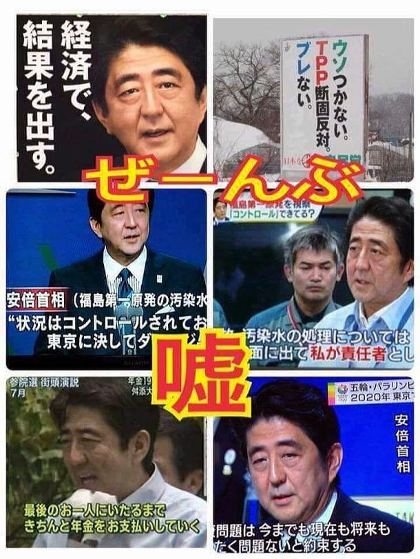 厚顔無恥で息を吐くように嘘をつく、安倍首相。これまで数々の嘘をついて国民を騙してきた。安倍晋三という政治家は嘘をつくのが仕事なんでしょうか? 安倍:『TPPは米韓FTAよりマシと言ったな、あれは嘘だ。自民党6条件は守るといっ たな、それも嘘だ』 安倍:『竹島の日式典を開催すると約束したな、あれは嘘だ』 安倍:『朝鮮総連幹部再入国禁止!と言ったな、あれは嘘だ』 安倍:『TPPに参加しないと約束したな、あれは嘘だ』 安倍:『竹島提訴すると約束したな、あれは嘘だ』 安倍:『生活必需品は消費増税の対象外と約束したな、あれは嘘だ』 安倍:『尖閣に公務員置くと約束したな、あれは嘘だ』 安倍:『老人の医療費2割自己負担と約束したな、あれは嘘だ』 安倍:『腹痛でやめたと言ったな、あれは嘘だ』 安倍:『河野談話見直すと約束したな、あれは嘘だ』 安倍:『韓国には厳しい態度でいくと約束したな、あれは嘘だ』 安倍:『政権とったら電気代安くすると約束したな、あれは嘘だ』 安倍:『発電と送電を分けると言ったな、あれは嘘だ』 安倍:『金銭解雇はしないと言ったな、あれは嘘だ』 安倍:『ブッシュに慰安婦謝罪はしていないと言ったな、あれは嘘だ』 安倍:『拉致被害者を北朝鮮に返すなと主張したと言ったな、あれは嘘だ』 安倍:『TBSに9条1項は変えないと言ったな、あれは嘘だ』 安倍:『春の例大祭に靖国参拝するようなフリをしたな、あれはデマだ』 安倍:『IOC総会で汚染水は完全にブロックされていると言ったな、あれは嘘だ』 安倍:『菅が俺をデフレ脱却の鬼と呼んでいたな、あれは嘘だ』 安倍:『増税の代わりに低所得者には現金を給付すると約束したな、あれは一万だ』 安倍:『消費税は全額社会保障に使うと約束したな、あれは嘘だ』 安倍:『消費税増税と議員定数削減はセットでやると約束したな、あれは嘘だ』 安倍:『TPP重要5品目などの聖域を最優先。確保できない場合は脱退も辞さずと言った な、あれは嘘だ』 安倍:『毎日官邸で福島の米を食べていると言ったな、あれは嘘だ』 安倍:『マスゴミが俺が消費税を上げるとかトバシていたな、あれは嘘だ、というのは 嘘だ』 安倍:『尖閣を断固守る!中国に一歩も引かない!といったな、あれは嘘だ』 安倍:『台湾に尖閣海域の漁場をやったな、あれはサプライズだ』 安倍:『終戦記念日に靖国参拝するフリをしたな、あれはデマだ』 安倍:『アベノミクスでベア企業が5年ぶりに二桁になったと言ったな、あれは嘘だ』 安倍:『総合政策集Jファイルは国民と自民党の約束と言ったな、あれは嘘だ』 安倍:『村山談話をそのまま継承することは無い、安倍談話を出す、と言ったな、あれ は嘘だ』 安倍:『秋の例大祭に靖国参拝をするフリをしたな、あれはデマだ』 安倍:『米国に50兆差し出し7月に5.2兆差し出し9月にまた50兆差し出したと報じられ たな、あれは本当だ』 安倍:『自民党がゼネコン業界に政治資金4億7100万円の政治献金を請求していた ことを赤旗が暴露したな、あれは本当だ』 安倍:『天皇陛下や皇室の政治利用はいけないと言ったな、あれは嘘だ』 安倍:『一太が首相にはいい加減な情報や二枚舌は通用しないといったな、二枚舌は俺 だ』 安倍:『徳田を自民のホープ、日本のホープと言ったな、あれは嘘だ』 安倍:『特定秘密保護法をやるとは言って言わなかったな、でも実行だ』 安倍:『特定秘密保護法は諸外国で法制化しているものと同様のもので日本だけが遅れ ているといったな、あれは嘘だ』 安倍:『特定秘密保護法は国民を守るためのものだと言ったな、あれは嘘だ』 安倍:『ヤジは議場の華と言ったな、あれは嘘だ』 安倍:『特定秘密の妥当性をチェックする第三者機関を設置すると言ったな、あれは嘘 だ』 安倍:『アメリカ政府が航空会社にフライトプランの提出を要請したことはないと確認 したといったな、あれは嘘だ』 安倍:『民主党が政権中に3万件破棄したようなことをできなくします、といったな。 あれは嘘だ』 安倍:『原発廃炉を実現すると言ったな、あれは嘘だ』 安倍:『原子力に依存しなくてもよい経済社会構造を目指すとも言ったな、あれは嘘 だ』 安倍:『特定秘密保護法でマスコミは捕まらないと言ったな、あれは嘘だ』 安倍:『特定秘密保護法をこれからも国民にしっかり説明していくと言ったな、それは 無理だ』 安倍:『バイク増税は新車限定だと言ったな、あれは嘘だ』 安倍:『俺がNHKを私物化したと報じられたな、あれは本当だ』 安倍:『ASEAN首脳との夕食会でクールジャパンとしてAKBを見せたと言ったな、あれ は本当だ』 安倍:『2030年を目標に脱原発をすると言ったな、あれは嘘だ』 安倍:『天皇が誕生日に『憲法を大切にしたい、当時の方々に感謝している』といった な、NHKでその部分だけは丸ごとカットだ』 安倍:『ミャンマーへの5000億円の債務帳消しからの新たに910億円を供与したと報じ られたな、あれは本当だ』 安倍:『しかし、ミャンマーでの国際事業でKDDIも住友商事も入札惨敗したな、それも
