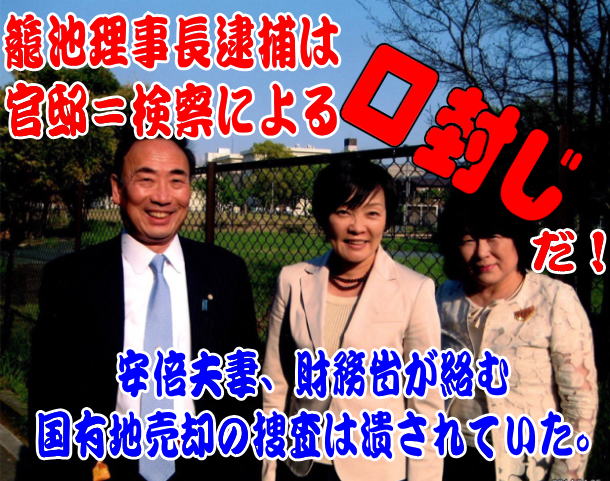 ![]() とうとう森友学園・籠池泰典前理事長夫妻が大阪地検特捜部に逮捕された。籠池前理事長は逮捕前、検察の動きを「国策捜査だ」と批判していたが、たしかに、これは安倍政権と財務省の疑惑を隠蔽し、籠池氏を口封じするための逮捕としか思えない。 というのも、国会が開かれていないという安倍政権にとってもっとも都合のいいタイミングでの逮捕であることに加え、容疑は本丸の国有地売却問題と全く関係のない補助金詐欺容疑だからだ。 たしかに、籠池前理事長は、国有地を取得して開設を目指した小学校舎の建設にあたり、金額の異なる契約書を作成。木材を使った先進的な建築に対して支給される国の補助金計約5600万円を不正受給した疑いで告発されていた。また、大阪府からも、幼稚園の教員数と、障害のある園児数に応じて交付される補助金計約6200万円を不正に得たとして、告発を受けていた。 しかし、これらはそれこそ、森友問題の核心部分をごまかし、籠池前理事長の口封じをするための容疑であり、事件の枝葉末節に過ぎない。 森友問題の核心であり端緒は、当たり前だが、国有地が約8億円も値引きされタダ同然で払い下げられたことであり、その過程に、当時の武内良樹近畿財務局長(現国際局長)、財務省で国有地を直轄する最高責任者である当時の迫田英典理財局長、さらには内閣総理大臣である安倍首相や昭恵夫人がどう関与したか、だ。 だいたい、籠池前理事長が補助金詐取をしていたとしても、それは財務省から国有地をタダ同然で売却してもらってはじめて行えるものだ。近畿財務局の8億円の値引きがないと、森友学園はそもそも土地を取得できず、小学校建設もできなかった。順番からいっても、最初に国有地8億円値引き売却の問題を捜査すべきなのである。 しかし、検察はその核心部分については捜査する気がまったくないようだ。国有地8億円値引きは、この7月13日にも弁護士ら246人が「交渉に当たった財務省近畿財務局が土地を不当に安く売って国に損害を与えた」として近畿財務局長らを背任で告発。大阪地検特捜部は告発状を受理し、マスコミも「いよいよ近畿財務局を背任容疑で捜査か」と煽っていた。しかし、実状はまったく違う。司法担当記者が語る。 「検察は表向き、国策捜査という批判を受けないために告訴状を受理し、捜査に前向きな姿勢を示していますが、国有地売却の捜査はすでに、潰されているんです」 実は近畿財務局に対する告発は今年3月にも豊中市議らが行っており、大阪地検特捜部は6月に、森友学園への強制捜査とセットで、近畿財務局を背任容疑でガサ入れすることを考えていたという。ところが、蓋を開けてみたら、結局、森友学園への補助金適正化法違反、補助金詐欺での強制捜査だけになっていたのだ。 「大阪地検特捜部は2009年の村木厚子(厚生労働省局長)さんの冤罪逮捕・証拠改ざん事件を引き起こして以降、信用は地に落ちたまま。他省庁の不正を単独で捜査する力はない。最後のチャンスが森友へのガサ入れの時に一緒にやることだった。現場はそれで証拠をつかめば、一気にやれるかも、と考えていた。ところが地検上層部が頑として首をたてにふらなかったんです」(前出・司法担当記者) 検察は国税庁と連携して脱税摘発する関係なので、もともと財務省には弱く、20年前、東京地検特捜部が大蔵省接待汚職を摘発したことで、関係が悪化したトラウマもある。 だが、今回、地検上層部が近畿財務局へのガサ入れを止め、国有地払い下げ問題に触れさせないようにしたのはやはり、安倍首相や昭恵夫人が捜査対象になる可能性があるからだ。 「法務省から大阪地検には相当なプレッシャーがあったようです。地検幹部が毎日のように本省から連絡が入ってくる、とぼやいていましたから」(検察関係者) しかも、今回の籠池前理事長夫妻逮捕も、官邸の意向に沿った「国策捜査」として近いうちに行われるだろうという見方が前々からささやかれていた。