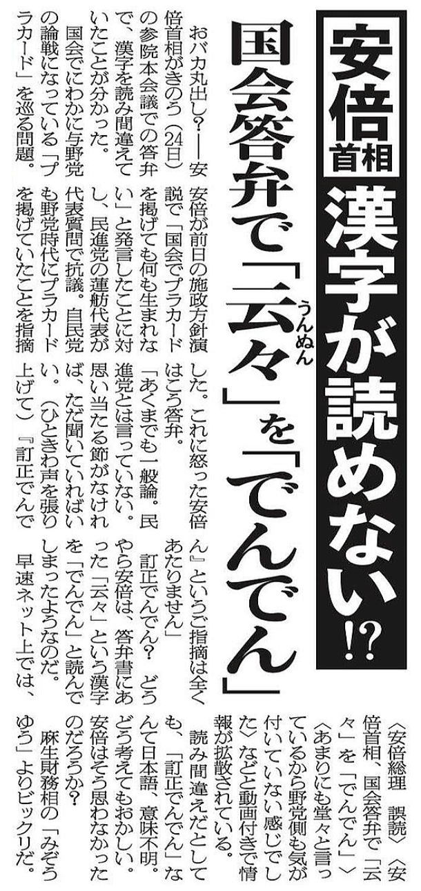 ![]() 昨日24日におこなわれた参院代表質問において、またも安倍首相の口からトホホな発言が飛び出した。 それは民進党の蓮舫代表への答弁で起こった。安倍首相の「国会でプラカードを掲げても何も生まれない」発言に対し、蓮舫代表は自民党も国会で下野時代にプラカードを掲げていたことを突っ込んだのだが、これに安倍首相は猛然と、このように反論した。 「これは一般論であって、民進党のみなさんだとは一言も申し上げていないわけであります。自らに思い当たるフシがなければ、これはただ聞いていただければいいんだろうと、このように思うわけであります!」 野党批判となるとヒートアップするのはいつものことだが、昨日もこう喋っているうちにハイテンションに拍車がかかった安倍首相。そして、意気揚々とおなじみの「ご指摘はまったくあたりません」なる決めゼリフをぶちかまそう……としたのだが、その前に耳を疑う言葉が出てきたのだ。 「訂正でんでんというご指摘は、まったくあたりません」 訂正……でんでん? まさか元お笑い出身の性格俳優のこと? いや、この流れで意味がわからないし。……あ、もしや「云々」を「でんでん」と読んだとか?? それ、にんべんないし、そもそも「でんでん」なんて言葉ないし! と、ここまで整理するのに要した時間は約30秒。しかし、テレビのなかの安倍首相は、漢字を読み間違ったことにもまったく気付かぬまま答弁をつづけたのだった。 得意気に、かつあまりにも堂々と「でんでん」と発した口ぶりから察するに、安倍首相はこれまでも「云々」は「でんでん」と読むと勘違いしたまま齢62歳までやってきたのだろう。 実は、安倍首相にはこれまでにも「漢字に弱すぎないか?」という疑惑があがっていた。