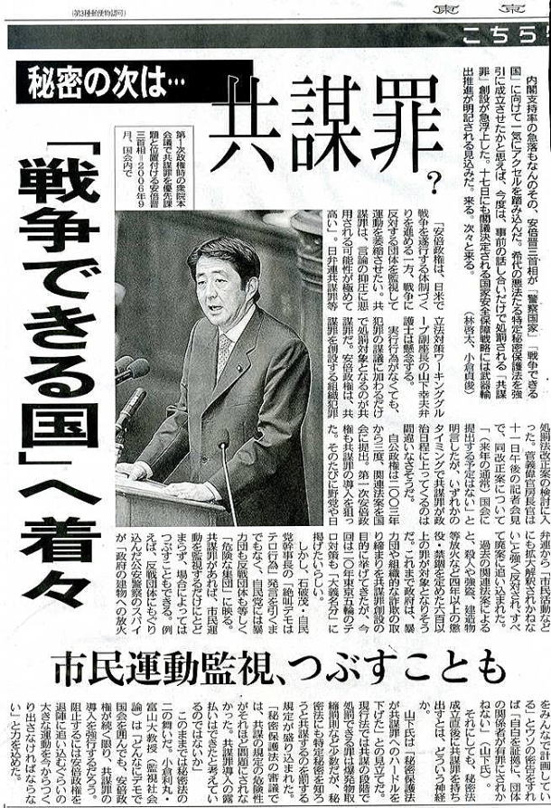 あらためて確認するまでもなく、言論には言論で対抗するのが民主主義だ。それを安倍政権は、批判を封じるためにテレビ局へ圧力文書を送りつけたり、百田尚樹と一緒になって「マスコミを懲らしめる」「沖縄の新聞はつぶさなあかん」と言論統制を明言し、安倍首相は「言論の自由」などと容認してきた。無論、政治家が気に入らない報道に圧力をくわえることは「言論の自由」とは言わない。たんなる「言論弾圧」だ。 だいたい、加計学園問題は、政策や資質への批判ではなく、「総理のご意向」という最高権力を振りかざして自身の「腹心の友」に特別な便宜を図ったのではないかという、権力の濫用が指摘されている重大な疑惑だ。さらに、具体的な関与が記された文書が出てきたのだから、しっかりと説明することは当然の責任である。 だが、そうした責任を果たさないままに、安倍首相は報道を〈言論テロ〉と位置づけたのだ。しかも、共謀罪の恣意的運用が懸念される最中に、である。 じつは、安倍政権は共謀罪のこうした恣意的運用をもはや隠していない。自民党は4月29・30日に幕張メッセで開かれた「ニコニコ超会議」の自民党ブースにおいて、〈テロ等準備罪について「デマ」を流す人は、この法律ができたら困るから〉などと書いたチラシをばらまいている。ようするに、共謀罪批判を「デマ」と決めつけた上で、その批判をしただけで「この法律ができたら困る人=テロリスト」と認定しているのである。 そして、今回の安倍首相による「朝日新聞は言論テロ」認定。これでもう共謀罪の本質は白日の下に晒されただろう。安倍首相にとって「テロ」とは、すなわち「自分にとって都合の悪いもの」でしかないのだ。 共謀罪が施行されれば、朝日新聞はもちろん、本サイトももれなく「組織的犯罪集団」として摘発を受けるだろう。さらに、双眼鏡や地図など持っておらずとも、政権を批判する一般市民もテロリストとして逮捕され、この国からは言論の自由、表現の自由は一切、姿を消す。言論弾圧とそれに追随した萎縮の果てに待っているのは、お手盛りの報道だけが流れ、市民が監視しあう社会だ。つまり、完全な独裁体制の出来上がりである。 今回の安倍首相の「言論テロ」認定問題は、いかにこの国が瀬戸際に立たされているかを示している。この露骨な「宣戦布告」に、とくに報道機関は黙っていてはいけないはずだ。 (編集部) 【出典】LITERA 2017.05.22