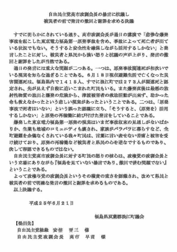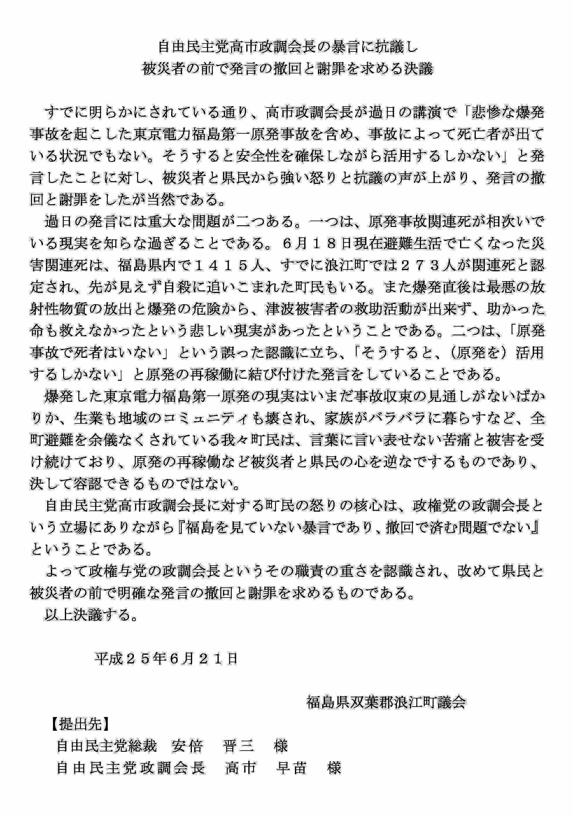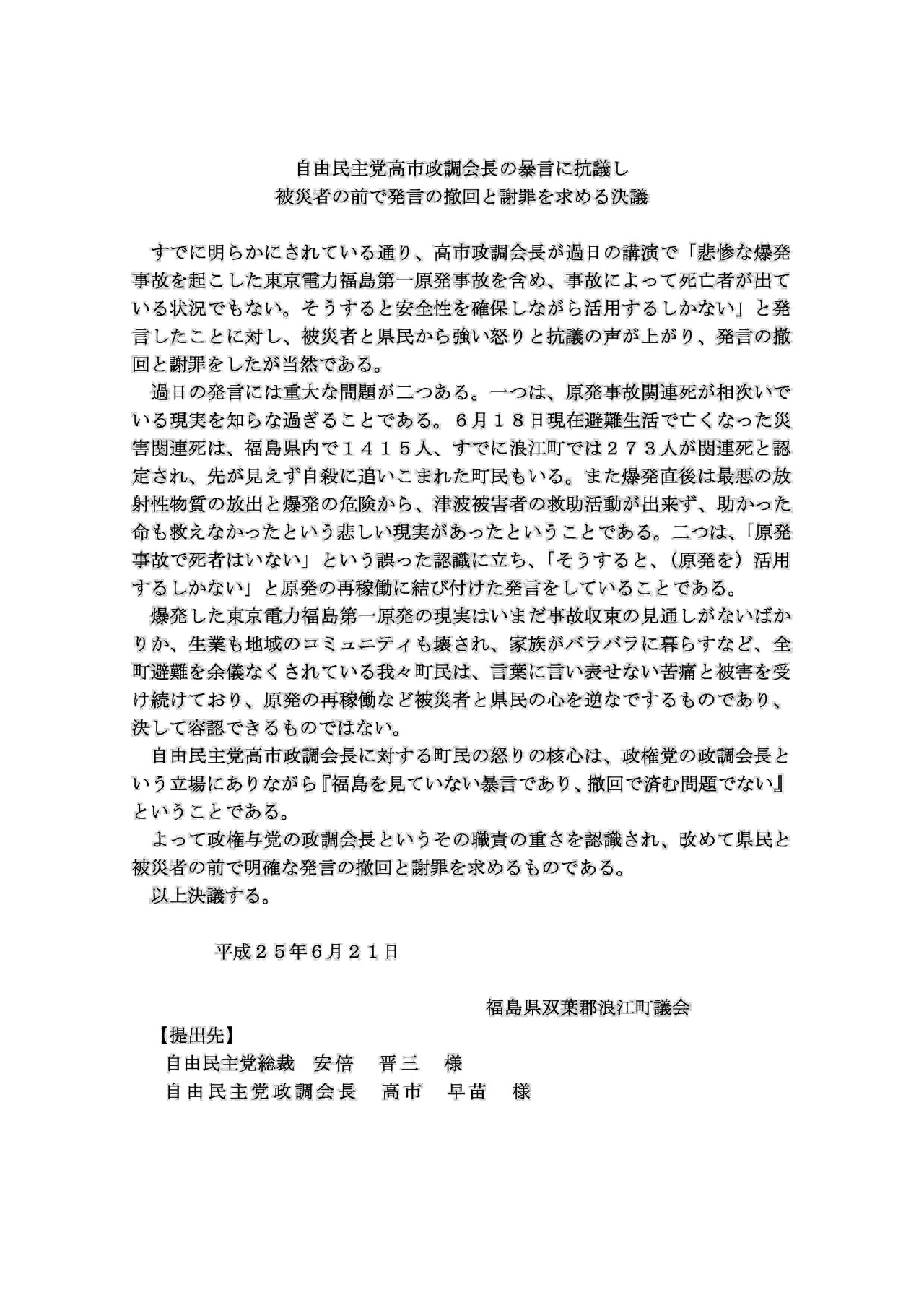 <★鉢呂氏は「死の街」発言で経産大臣を辞任した。高市氏の「原発事故死者なし」発言は撤回で済むのか(私見)> 高市氏、原発発言を撤回 自民福島県連は党本部に抗議文(朝日新聞デジタル) |