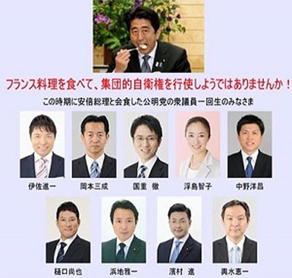 週刊誌L'Obs (旧 Le Nouvel Observateur)の2015年5月21日(通巻2637)に掲載されたLA FACE CACHÉE DE SHINZO ABE (アベシンゾーの隠された顔)という記事です。 Japon LA FACE CACHÉE DE SHINZO ABE Loin de son image de réformateur économique, le Premier ministre japonais est lié à une organisation d’extrême droite révisionniste qui prône un retour à l’empire (経済改革者のイメージと程遠く、日本の総理大臣は、帝国への回帰を称える極右団体に関係している。) VINCENT JAUVERT それは国際政治で、大幅に無視されているとはいえ、主要な事実だ。世界第三の経済大国である日本は、数か月前から、(総理大臣、安倍晋三も含めて)閣僚の4分の3が、歴史修正主義で権威主義の極右団体、「日本会議」と呼ばれる、目立たないが影響力のある団体に属していることだ。 2012年12月に政権に復帰したとき、安倍晋三が、新自由主義的であると同時に戦前に郷愁を抱く強硬な右翼出身の政治家であることを知らない者はなかった。プーチンやインドの国粋的指導者モーディを称賛していることも知られていた。 安倍が近かった、祖父の岸信介が1932年に大日本帝国によって併合された満州のナンバー2であり、次に戦争中に東條内閣の一員であったこと、そして結局、1945年の敗戦の後、A級戦犯として投獄されていたことも、誰もが知っていた。 しかし明らかに、反動的で反民主主義的なイデオロギーへの安倍晋三の政治的根強さは過小評価されていた。「数か月前まで、安倍の最終目的は有名なアベノミクス(編集部注:安倍の名を冠した経済再建計画)によって日本経済を立て直すことだと多くの人が考えていた」、上智大学‘国際教養学部)教授の中野晃一は分析する。 「今日、安倍が本心を隠さないで行動しているのか、戦後に採択された平和的で自由で民主的な憲法の根本的な改変を日本人により容易に”売り込む“、という目的のためだけに経済的成功を追及しているのではないかと疑問視されている。そうして、彼が1997年の創設時から加入している団体、日本会議に特有の、帝国主義に憧れを持つ、古い秩序への回帰を押しつける目的でも。」 「逆説的だがこの非常に重要な団体は日本では未だに真価を認められていない」、日本版『リベラシオン』ともいえる『東京新聞』に昨年夏、日本会議に関する初めての長い記事を書いた佐藤圭は言う。 「その出発から、日本会議はレーダーに現れないようにあらゆる注意を払ってきた。広告も出さないし、テレビにも出ない。戸別訪問的な活動をしながら、視線の及ばないところで前進していた。その集会はメディアに開かれていない。そして、会員たちには会談の間も、写真を撮る権利もない。」 この信じられない「ステルス性」にはもう一つの理由がある。 「日本会議は、より反動的な、地方で発展してきた」と、日本の右翼運動の専門家である法政大学の政治学者、山口二郎は説明する。 「大手メディアは、元々ローカルだったこの団体を見下していた。2012年12月の安倍内閣の指名と、さらに昨年秋の内閣改造後、日本会議所属の閣僚の数がさらに増えて、その強大さに面食らうまでは。それまでは田舎の、片隅のものと見なされていたこの極右団体が、日本の政治の中心にいたのだ。」 日本会議は1997年、一つは満州侵略を率いた帝国軍元司令官によって、もう一つは主に神道の宗教団体によって設立された、二つの極右団体の合併により生まれた。「反動的で1930年代に郷愁を抱くこれら二つの集団は、日本が戦争中に行った残虐行為の過ちを告白することに耐えられなかった。 彼らによれば、日本人は帝国に誇りを持たなければならなかった」と、山口二郎は説明する。「分裂したままではイデオロギー闘争に敗北しつつあったと理解したときに、合併した。」 彼らの自覚は1995年8月15日に起こった。村山首相が有名な謝罪宣言を述べたときである。その日、世界は第二次世界大戦終結の50周年を記念していた。 この機会に、日本が1930年代と1940年代に、「植民地支配」を押し付けるためにアジア諸国を「攻撃した」ことを、日本の政府のトップが初めて、公に、そして公式に認めたのだ。この認識は、帝国軍が政敵奴隷に頼っていたと1993年に認めた、内閣のナンバー2、河野洋平の宣言の後に来たものだ。 婉曲に「慰安婦」と呼ばれた女性たちは、朝鮮やフィリピンの村で誘拐され、強制的に軍の売春宿に住まわされた。反動主義者と超国粋主義者には、もう我慢できなかった。反論し、新しい運動、つまり日本会議を建設することが急を要した。 新しい団体の事務総長職は、1970年代の極右学生のリーダーで、今も強大な力を持つ、椛島有三なる人物に委ねられた。そしてこの団体は今、3万5千の会員と200の支部を数える。 289 PARLEMENTAIRES MEMBRES (289人の議員メンバー) 10年前に祖父が亡くなった安倍晋三は1997年に国会議員になる。お友だちと一緒に、直ちに「日本会議」に、次いで日本会議を支持する議員団体に加入する。「当時彼らは、保守のジミント