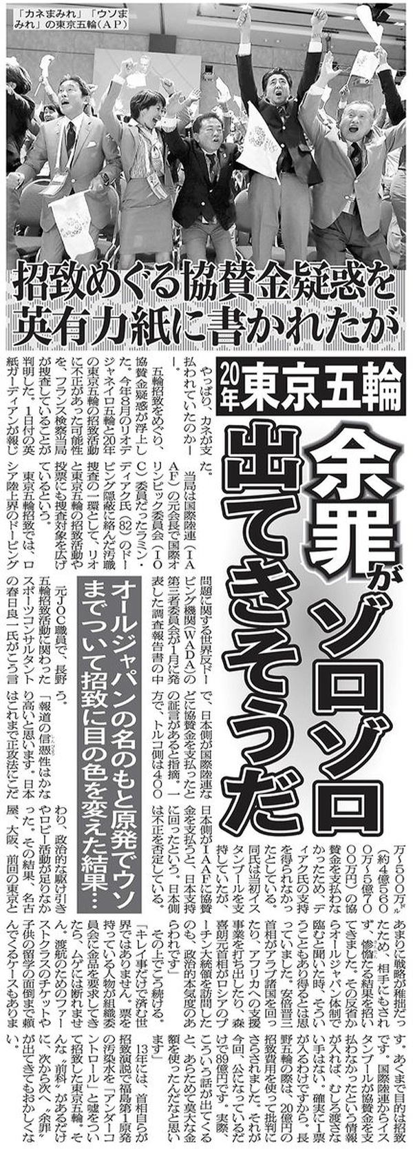 やっぱり、カネが支払われていたのか――。 五輪招致をめぐり、協賛金疑惑が浮上した。今年8月のリオデジャネイロ五輪と20年の東京五輪の招致活動に不正があった可能性を、フランス検察当局が捜査していることが判明した。1日付の英紙ガーディアンが報じた。 当局は国際陸連(IAAF)の元会長で国際オリンピック委員会(IOC)委員だったラミン・ディアク氏(82)のドーピング隠蔽に絡んだ汚職捜査の一環として、リオと東京五輪の招致活動や投票にも捜査対象を広げているという。 東京五輪招致では、ロシア陸上界のドーピング問題に関する世界反ドーピング機関(WADA)の第三者委員会が1月に発表した調査報告書の中で、日本側が国際陸連などに協賛金を支払ったとの証言があると指摘。一方で、トルコ側は400万~500万ドル(約4億5600万~5億7000万円)の協賛金を支払わなかったため、ディアク氏の支持を得られなかったとしている。同氏は当初イスタンブールを支持していたが、日本側がIAAFに協賛金を支払うと、日本支持に回ったという。日本側は不正を否定している。 ■さらなる“余罪”が出る可能性も 元JOC職員で、長野五輪招致活動に関わったスポーツコンサルタントの春日良一氏がこう言う。 「報道の信憑性はかなり高いと思います。日本はこれまで正攻法にこだわり、政治的な駆け引きやロビー活動が足りなかった。その結果、名古屋、大阪、前回の東京とあまりに戦略が稚拙だったため、相手にもされず、惨憺たる結果を招いてきました。その反省からオールジャパン体制で臨むと聞いた時、そういうこともあり得るとは思っていました。安倍晋三首相がアラブ諸国を回ったり、アフリカへの支援事業を打ち出したり、森喜朗元首相がロシアのプーチン大統領を訪問したのも、政治的本気度のあらわれです」 その上でこう続ける。 「キレイ事だけで済む世界ではありません。票を持っている人物が組織委員会に金品を要求してきたら、ムゲには断れません。渡航のためのファーストクラスのチケットや子供の留学の面倒まで頼んでくるケースもあります。あくまで目的は招致です。国際陸連からイスタンブールが協賛金を支払わなかったという情報が入れば、むしろ渡さない手はない。確実に1票が入るわけですから。長野五輪の際は、20億円の招致費用を使って批判にさらされました。それが今回、公になっているだけで89億円です。実際、こういう話が出てくると、あらためて莫大な金額を使ったんだなと思います」 13年には、首相自らが招致演説で福島第1原発の汚染水を「アンダーコントロール」と嘘をついて招致した東京五輪。そんな“前科”があるだけに、次から次へ“余罪”が出てきてもおかしくない。 【出典】日刊ゲンダイ 3月4日(金)9時26分配信