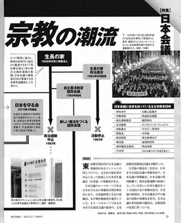 ☆-1 魚住 昭「日本会議-復古主義だけではない 現実の怖さとは」 近年,国内外で日本最大の右派運動団体とされる日本会議が注目されている。「安倍政権の黒幕」「日本を支配」といった評価も目立つ。だが,誰がその内部を動かしているのか,どのような経過で生まれてきたのかといった点についてはあまりしられてはいない。その実像を追う。 ☆-2 「一水会元顧問・鈴木邦男氏に聞く-左翼との闘いが日本会議の核をつくった」 鈴木邦男氏はかつて生長の家信者で,全国学協の初代委員長だった。その経験から,日本会議の誕生に至る経過と,内部事情を語る。生長の家が政治から手を引かなければ,日本会議は生まれなかった。 ☆-3 能川元一「『反米』か? 『東京裁判史観』批判の荒唐無稽-幼稚な陰謀論と歴史修正主義」 日本会議の代表的な論客の1人,高橋史朗氏。戦後になって戦争を反省したのは「占領軍の洗脳」のためだという。こんな「理論家」が幅を利かせているのが日本会議なのだ。 ☆-4 「本当の神道の姿を説く三輪隆裕宮司インタビュー -明治時代の天皇崇拝は神道の長い歴史では特殊」 日本会議は,「伝統」こそがあらゆる価値の中心とみなす。改憲も,「現行憲法は日本の伝統に合わない」からという。だがその「伝統」とは,神道では異端である明治時代の国家神道なのだ。 補注)なおこの三輪隆裕の見解については,前掲,本ブログ2016年06月04日の記述のなかで,『週刊金曜日』のこの記事からではなく,三輪のブログから直接引用するかたちで,その主旨を紹介してある。日本会議の宗教「的」な思想が,いかに日本伝統でもなんでもない,あくまも明治帝国主義の時代に淵源を求めるとすればそうできる「近代の奇形宗教」であり,しかも宗教とはいいえないようなエセ宗教の立場にあることが理解できるはずである。 ☆-5 「図解,日本会議を生んだ右派宗教の潮流-神社本庁,生長の家からはじまる反憲法運動70年」(成澤宗男・週刊金曜日編集部) 近年,注目を集めている日本会議。だが,1997年5月に結成されるはるか以前から,全国の大半の神社が加盟する神社本庁,及び生長の家を筆頭とした新興宗教の運動が,そこへと至る伏流として形成されていた事実がある。戦後のこれら右派宗教勢力の動向を知ることなしに,日本会議の本質は理解できないだろう。(これは『週刊金曜日』22・23頁)