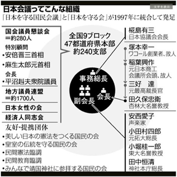 a) 会合,異例の配慮 --3月に入り,首相は憲法改正に積極的な国会答弁を繰り返していた。ところが党大会の20分のあいさつでは一言も触れず,「参院選前に拳を振りあげる必要はない」(自民党参院幹部)とする党内や公明党を意識したものと映った。その数時間後,一運動団体の非公開の会合で首相がみせた異例の配慮。 日本会議によると,第2次安倍政権の発足後,首相が日本会議の公式行事に出席するのは初めてだった。首相,正副官房長官,閣僚,首相補佐官,衆参両院議長,自民党役員,派閥領袖。「部外秘」とある《日本会議国会議員懇談会の名簿》(昨〔2015〕年9月15日現在)には,政府・自民党幹部の氏名が並ぶ。首相が特別顧問を務め,当時の会員281人のうち246人を自民党が占める。衆院の6割,参院の5割が属する。