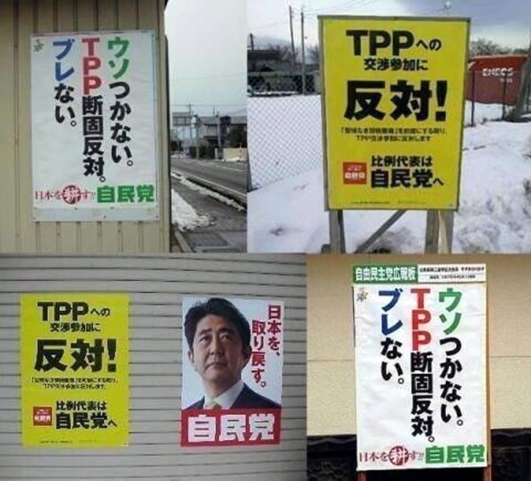 またしても安倍首相がお得意の二枚舌を披露した。昨日、衆院TPP特別委で、民進党・柿沢未途議員から「かつては断固反対と言っていたTPPに活路を見出そうとしているのではないか」と質問された安倍首相は、平然とした表情で、こう言い放ったのだ。 「私自身は、TPP断固反対と言ったことは一回も、ただの一回もございませんから。まるで私が言ったかの如くのですね発言は慎んでいただきたい」 ……言葉を失うとはこのことだ。柿沢議員は、安倍氏が自民党総裁として立ち、与党に返り咲いた2012年総選挙時の「ウソつかない。TPP断固反対。ブレない」という自民党ポスターを突きつけていたが、それを見ながらなお、安倍首相は「TPP反対なんて言ってない」とシラを切ったのだ。 ご存じの通り、この総選挙で安倍総裁はTPP反対を公約に掲げ、当然ながら安倍氏自身も「TPP反対」と何回も口にしている。たとえば、2013年2月23日の記者会見でも、オバマ大統領との日米首脳会談について問われ、こう述べている。 「私からは先の衆院議員選挙で聖域なき関税撤廃を前提とする限りTPP交渉に、交渉参加に反対するという公約を掲げ、また自民党はそれ以外にも5つの判断基準を示し政権に復帰をした、そのことを大統領に説明をいたしました」 また、2013年に発売した自身の著書『新しい国へ──美しい国へ 完全版』(文藝春秋)でも、このように記している。 〈御承知の通り、自民党は「『聖域なき関税撤廃』を前提にする限り、TPP交渉 参加に反対」という立場をとっております。なぜなら、あらかじめ「関税ゼロ」であることを呑んでしまっては、守るべきものは守れません。「TPPは第三の黒船だ。開国しないと日本の未来はない」という感情論に流されて、現実を見失うべきではありません。(中略)今、問われているのは、交渉する上での総合力です〉