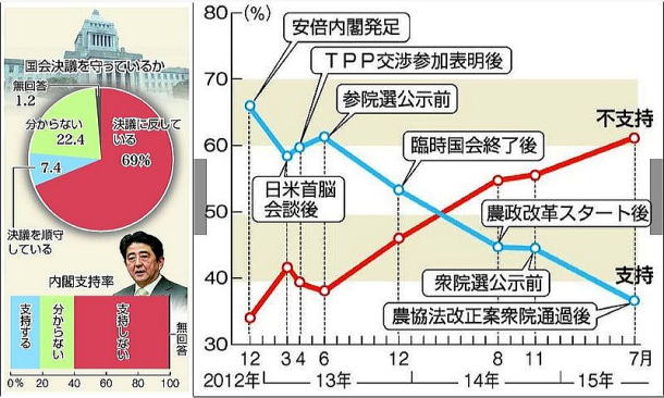 「支持率18%」への半減も当然だろう。2012年12月の政権復帰となった総選挙では、当時の民主党政権のTPP交渉に対し、「聖域なき関税撤廃を前提にする限り交渉参加に反対」との公約を打ち出し、13年4月には衆参両院の農林水産委員会は「農産物5項目」(コメ、麦、牛肉・豚肉、乳製品、サトウキビなど甘味資源作物)について「農家が生産を続けられるよう関税の交渉から除外または再協議の対象とすること」「(守れない場合は)交渉からの撤退も辞さない」と関税死守(聖域確保)を決議。 14年12月の総選挙では「経済連携交渉は、交渉力を駆使して、守るべきは守り、攻めるべきは攻め、特にTPP交渉は、わが党や国会の決議を踏まえ、国益にかなう最善の道を追求します」と公約を掲げていたはずだ。